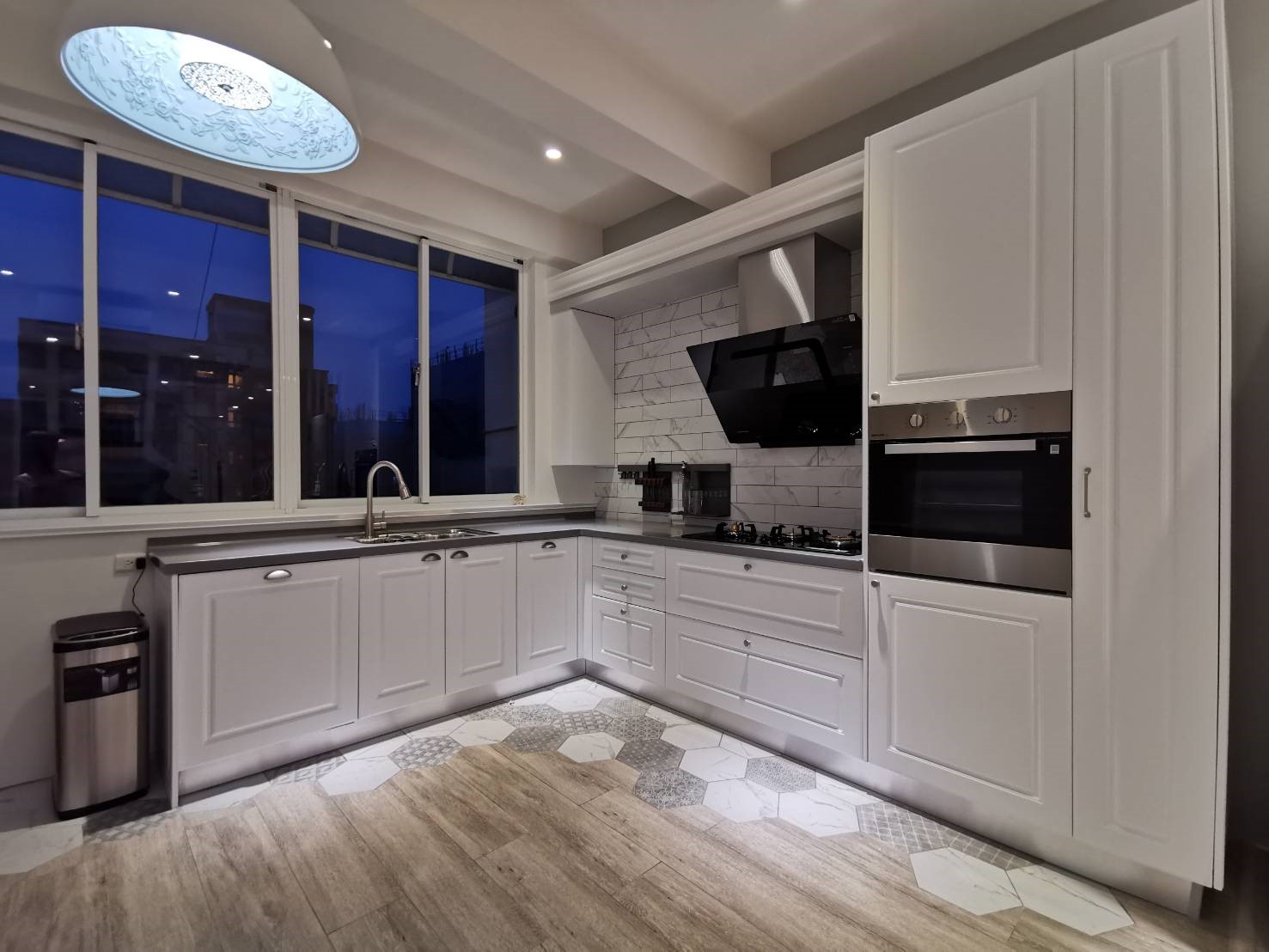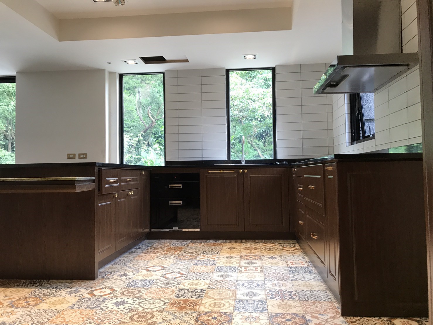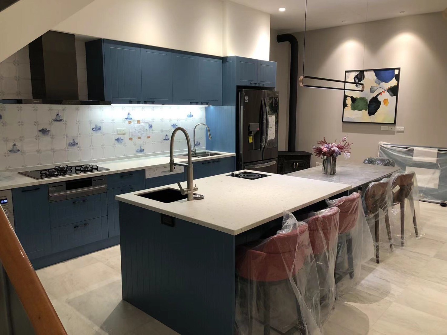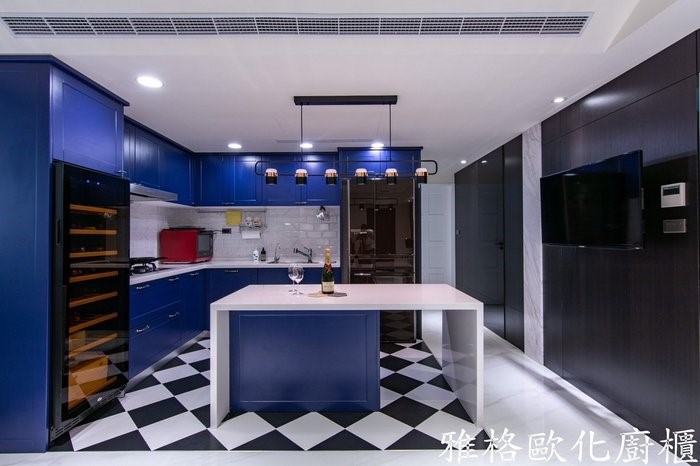 L型352cm櫥櫃+紅酒櫃+冰箱吊櫃+中島