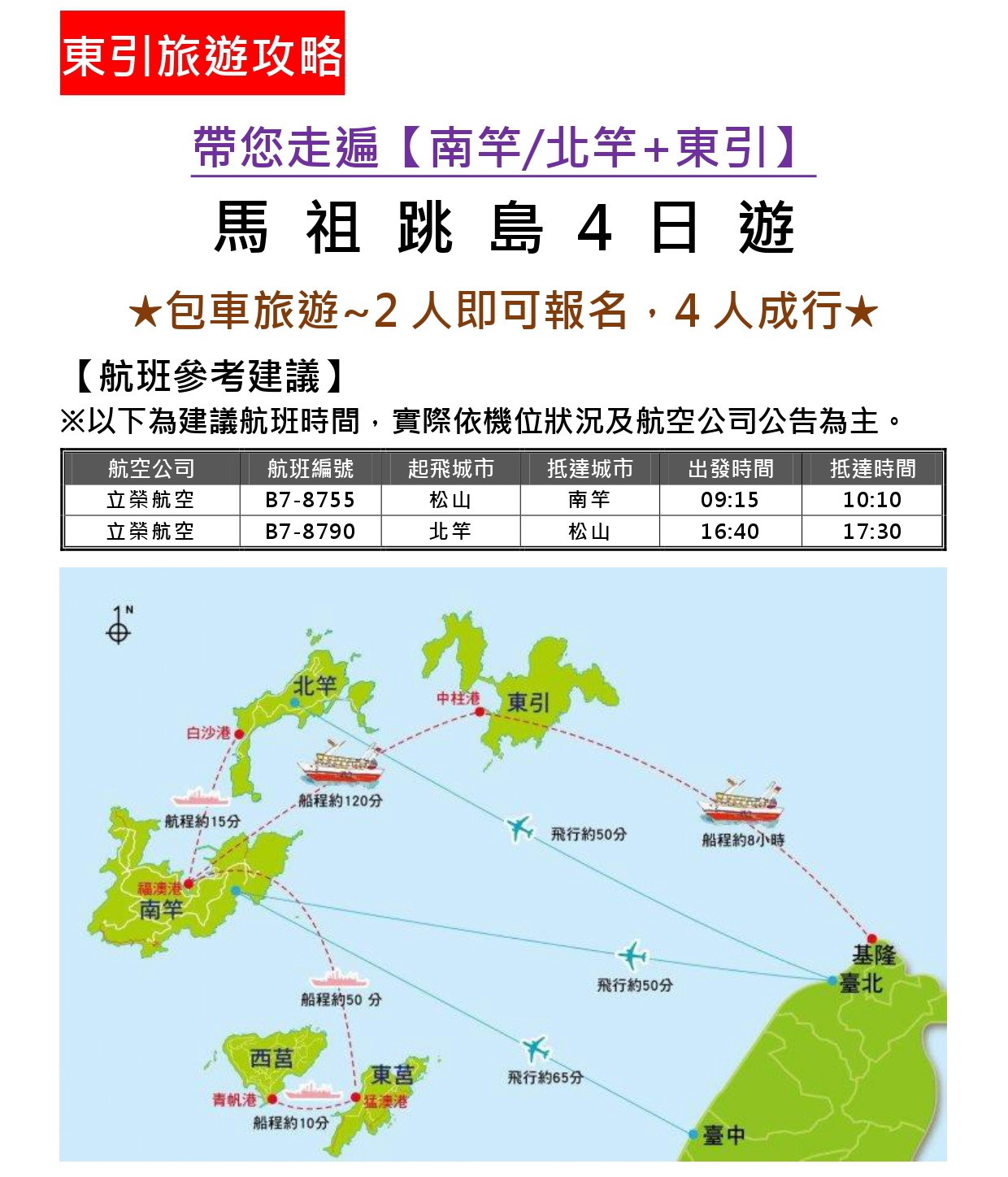 松山出發 → 馬祖4天包車遊~4人同行優惠價$16900/人