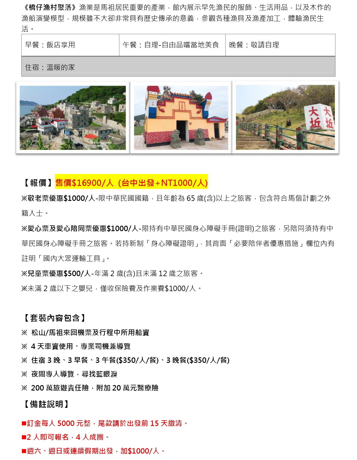 PS: 敬老/愛心/愛心陪同 三種身分者每人再減1000 只要$15900/人
