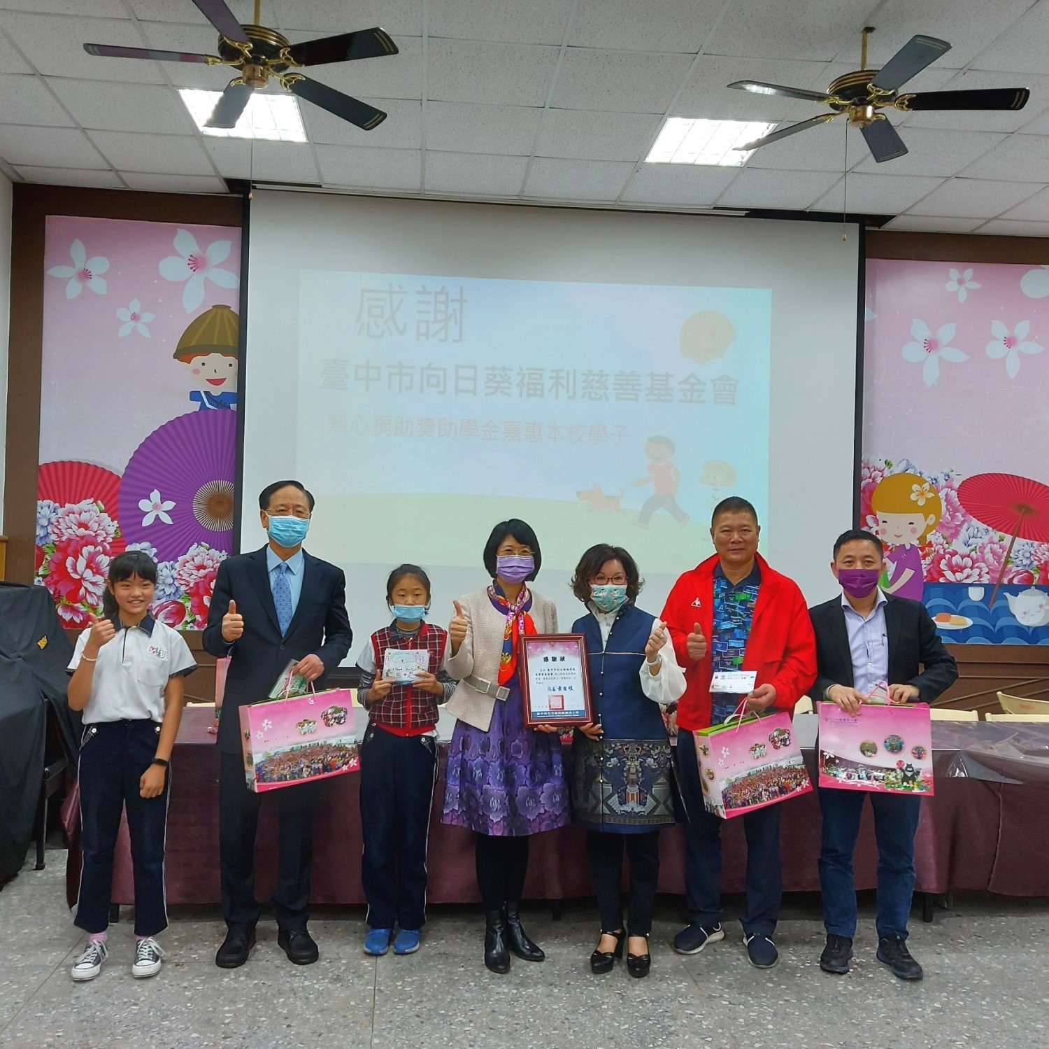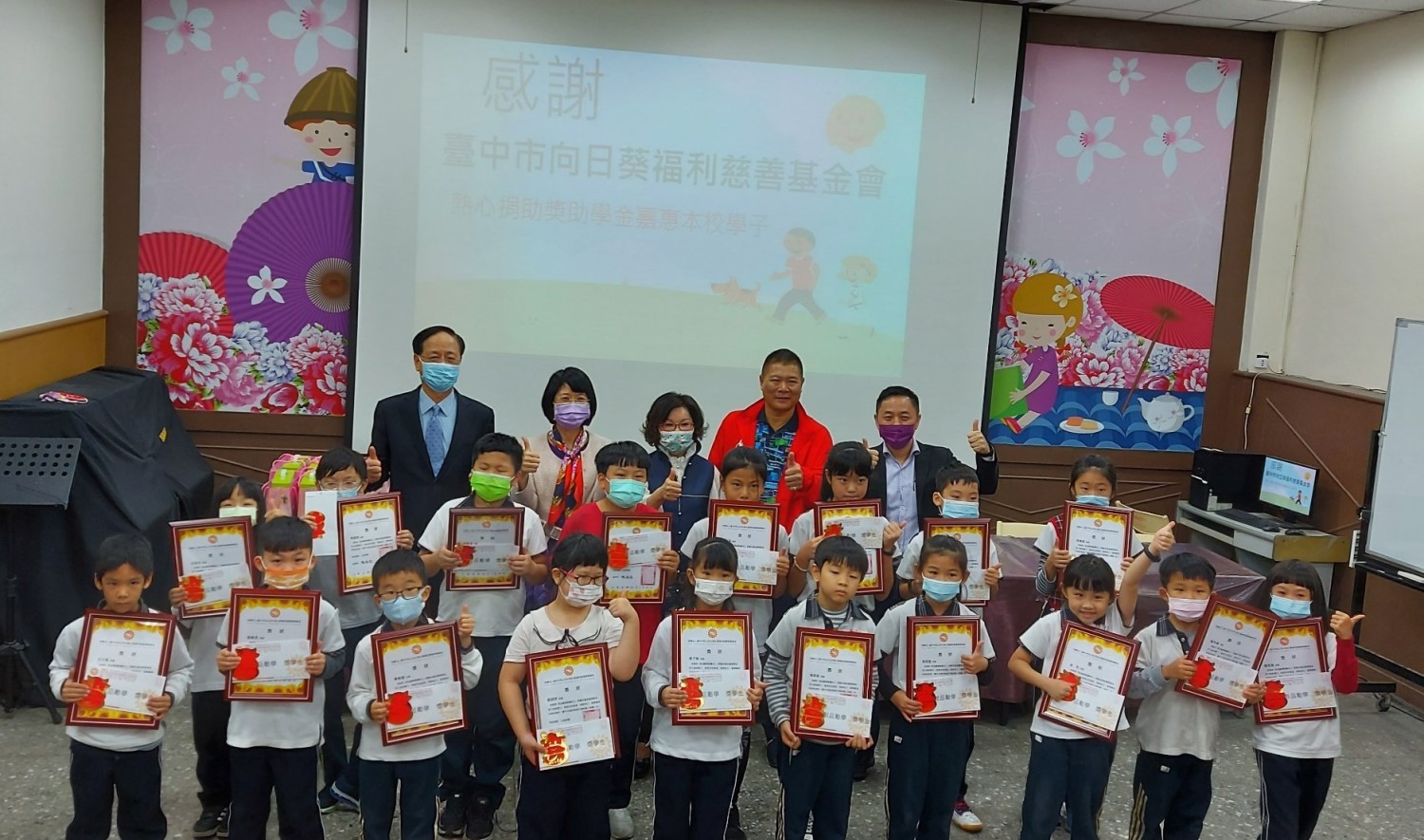 26日於四維國小頒發獎助學金予20位清寒優秀學童,盼激勵勤學向上,引領邁入美麗人生道路。黃圓媛校長代表全校師生頒發感謝狀以表感謝。
