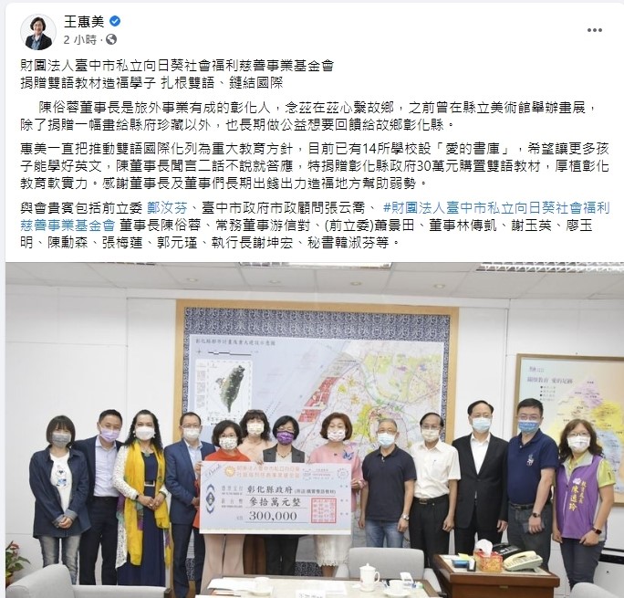 本基金會捐贈30萬,增添雙語學習教材,嘉惠本地學子,盼在外語教育學習資源,提供微薄之力,讓雙語教育扎根校園,提升在地國際場上的競爭力。讓彰化成為一個友善並擁有智慧網路商城的國際城市。