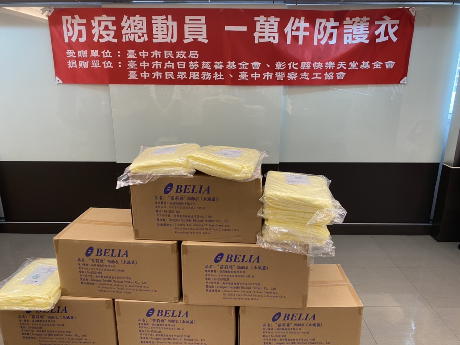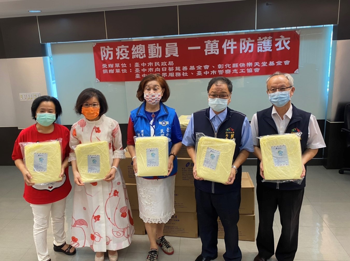 早上於民政局舉行公益捐贈儀式由本會(董事長陳俗蓉)、快樂天堂基金會(董事長林傳凱)、台中市民眾服務社(理事長郭元瑾)、臺中市警察志工協會(理事長游信對)共同捐贈一萬件防護衣予民政局,一同防疫守護家園,讓辛苦的一線防疫人員能在保障自身安全的前提之下,安心投入防疫工作。