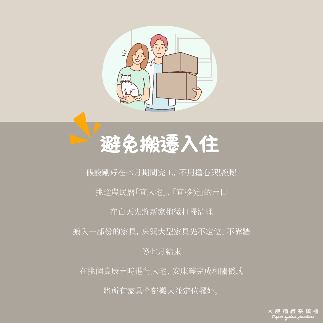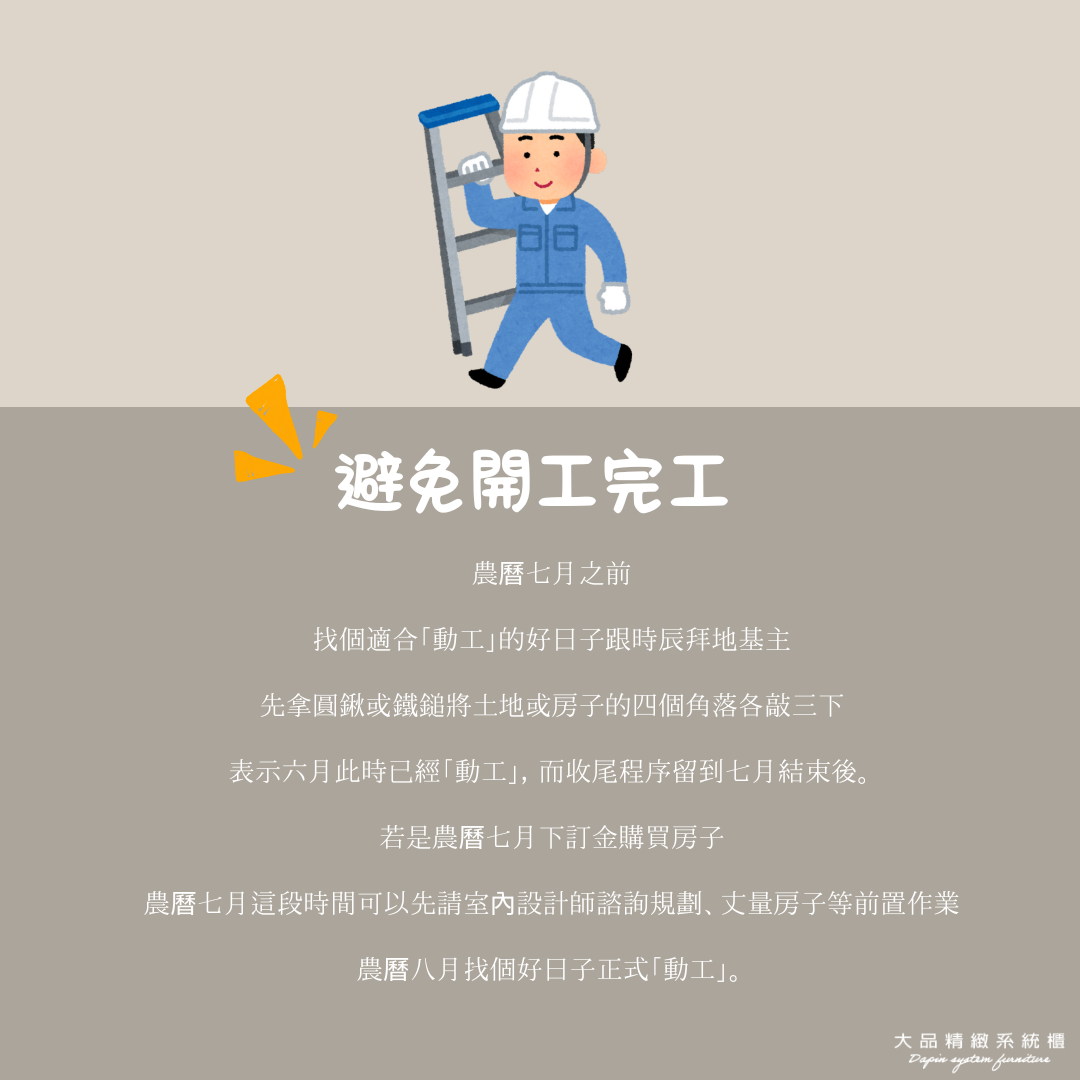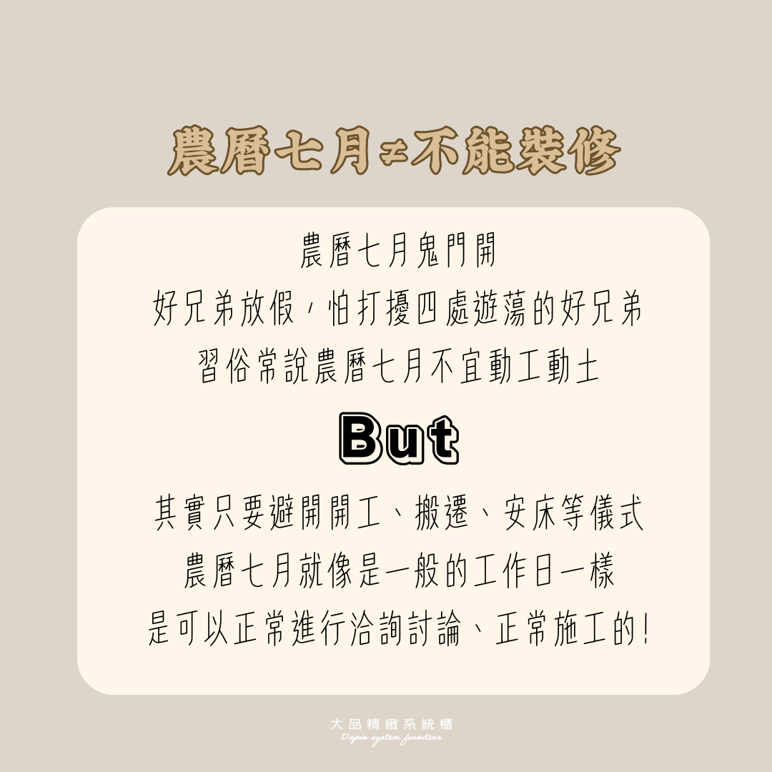 #農曆七月 #裝修指南 - 大品精緻系統櫃|裝修小知識 - 農曆七月鬼門開 好兄弟放假 怕打擾四處遊蕩的好兄弟👻 習俗常說農曆七月不宜動工動土👷🏻♀️👷🏻♂️ 其實只要避開開工、搬遷、安床等儀式 農曆七月就像是一般的工作日一樣 是可以正常進行洽詢討論、正常施工的.ᐟ.ᐟ