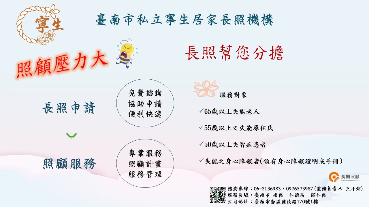 長期性生活照顧是一條漫長且辛苦的路程,對被照護者或家屬而言,都面臨極大的經濟與心理壓力,「長期照顧服務」從照顧人力的提供、專業人員的協助、居家無障礙空間的規劃到交通接送的服務,,幫助您大幅減輕照顧的重擔!