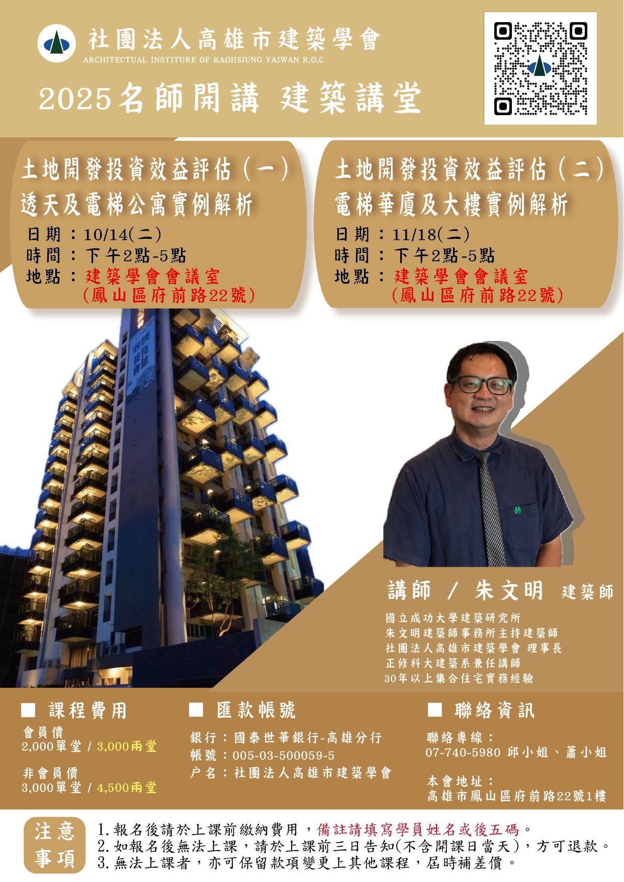 由社團法人高雄市建築學會主辦,邀請建築專業實務經驗豐富的朱文明 建築師,深入解析土地開發與投資效益評估,讓您以實例洞察建築背後的價值與邏輯!