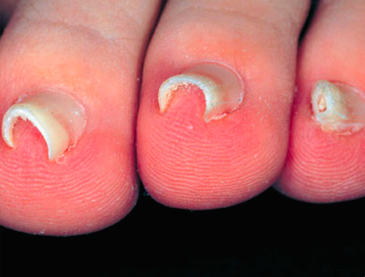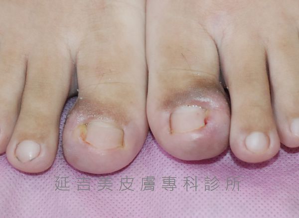 ♦ 嵌甲合併正在發炎的甲溝炎。應該先治療甲溝炎,直到無明顯發炎才可考慮矯正。