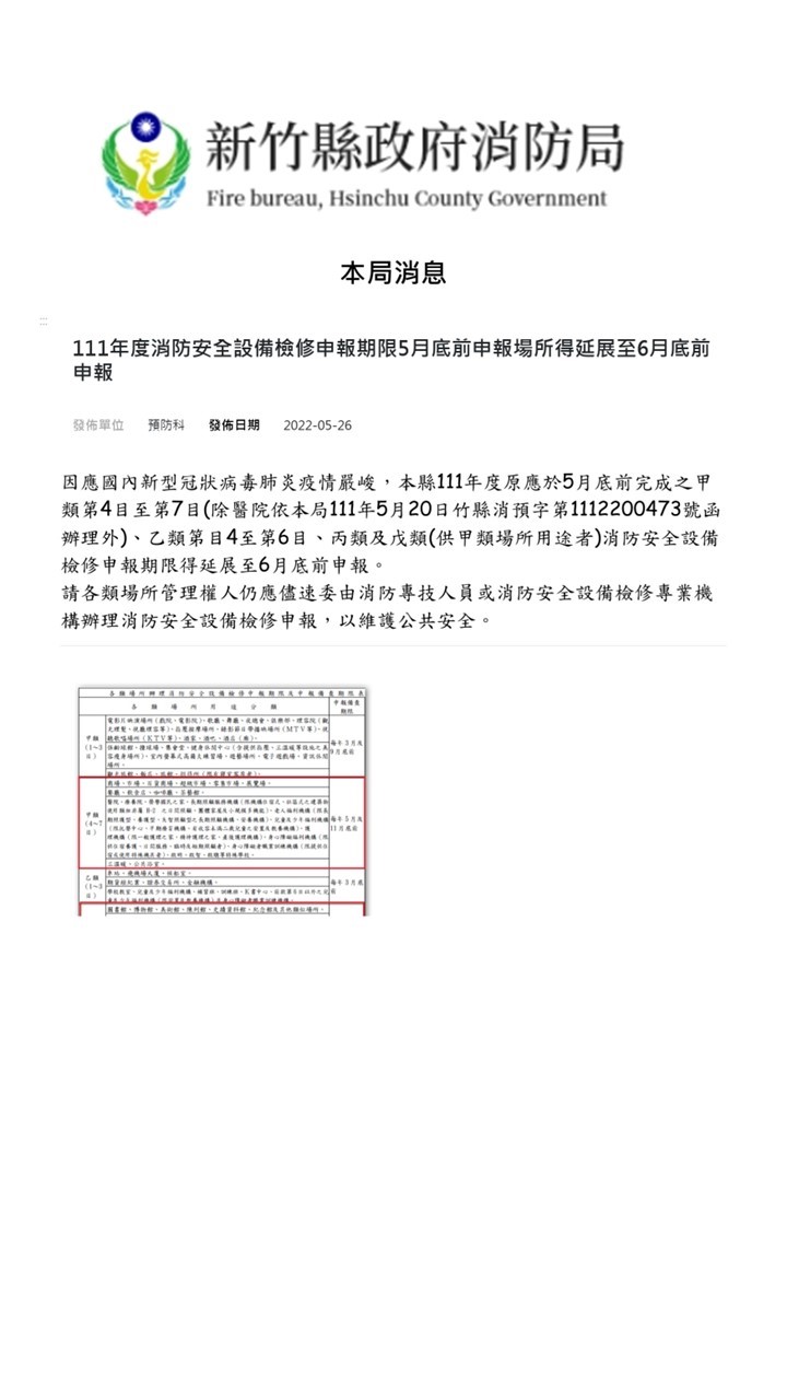 新竹縣111年度消防安全設備檢修申報期限5月底前申報場所得延展至6月底前申報
