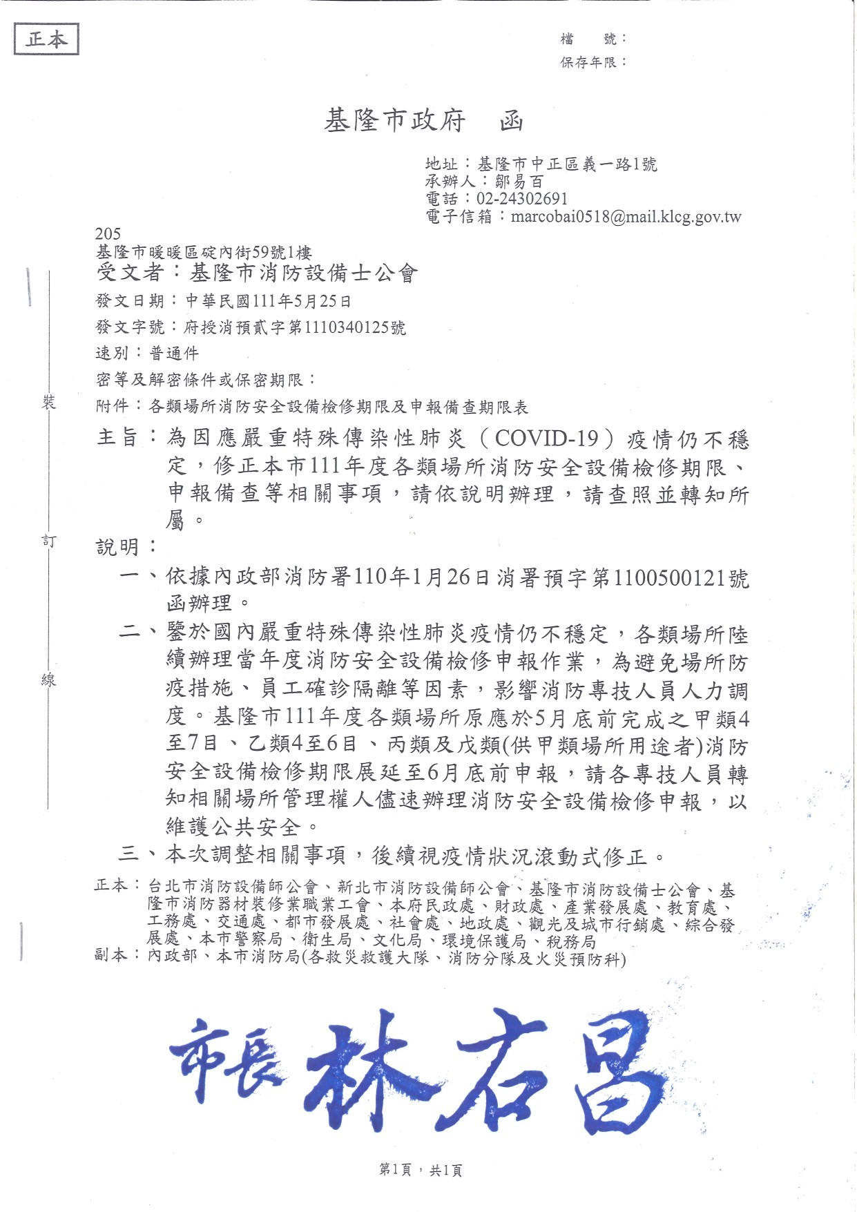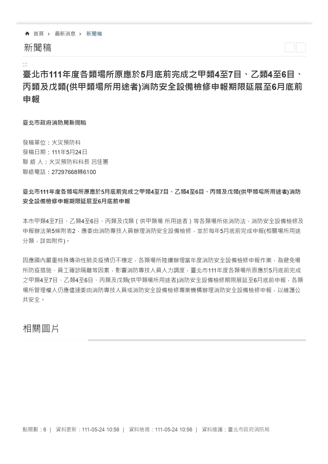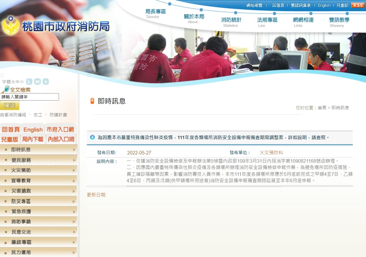 為因應本市嚴重特殊傳染性肺炎疫情,111年度各類場所消防安全設備申報備查期限調整案