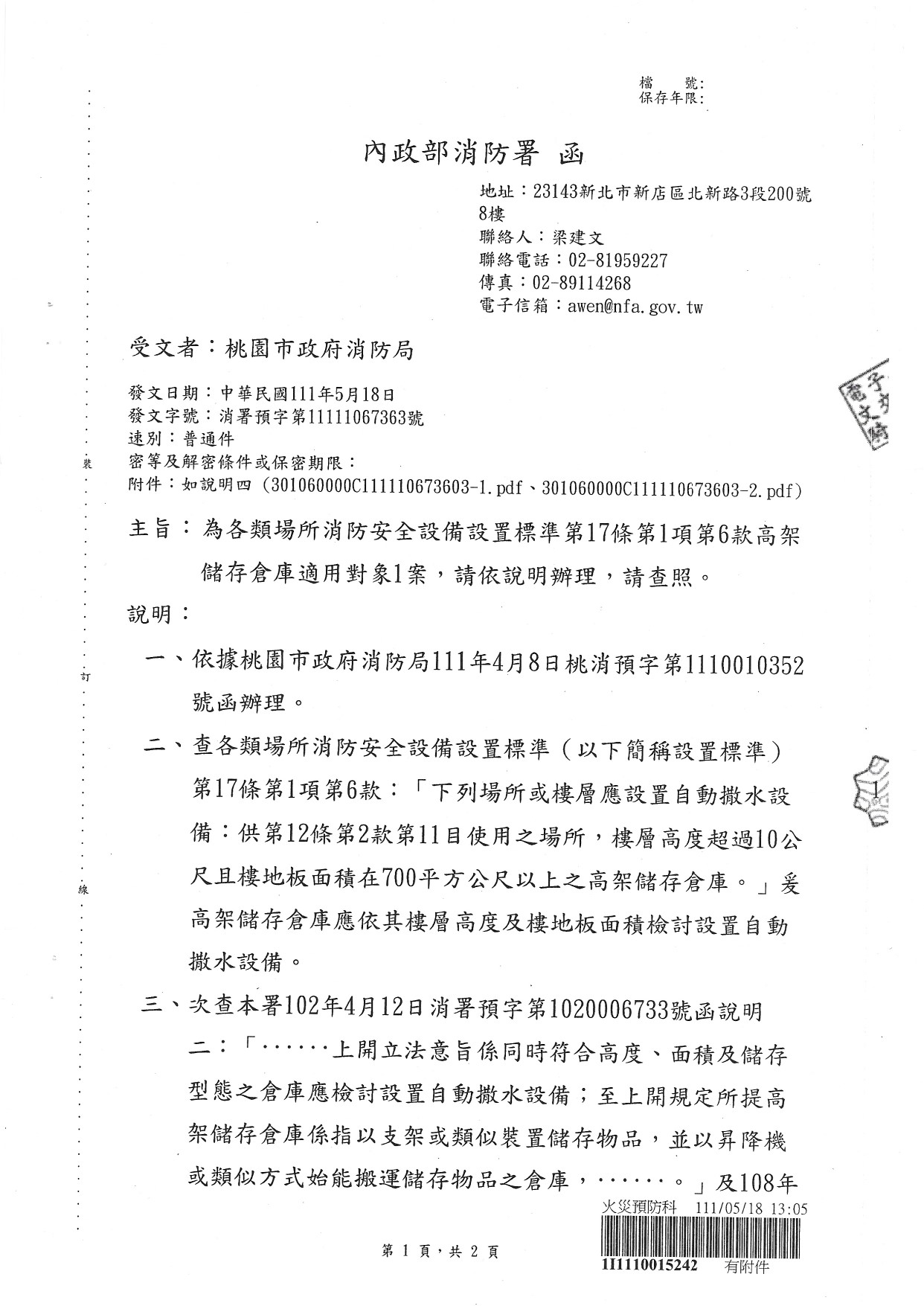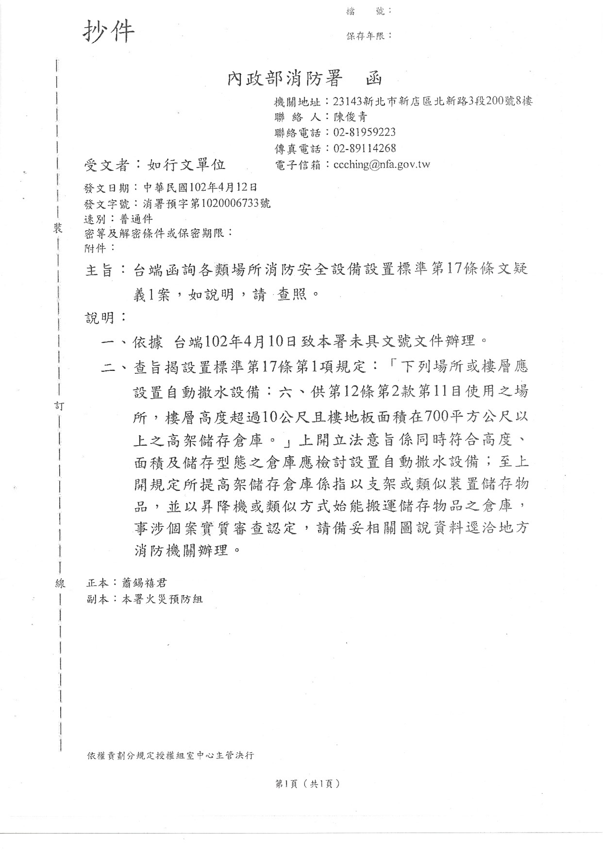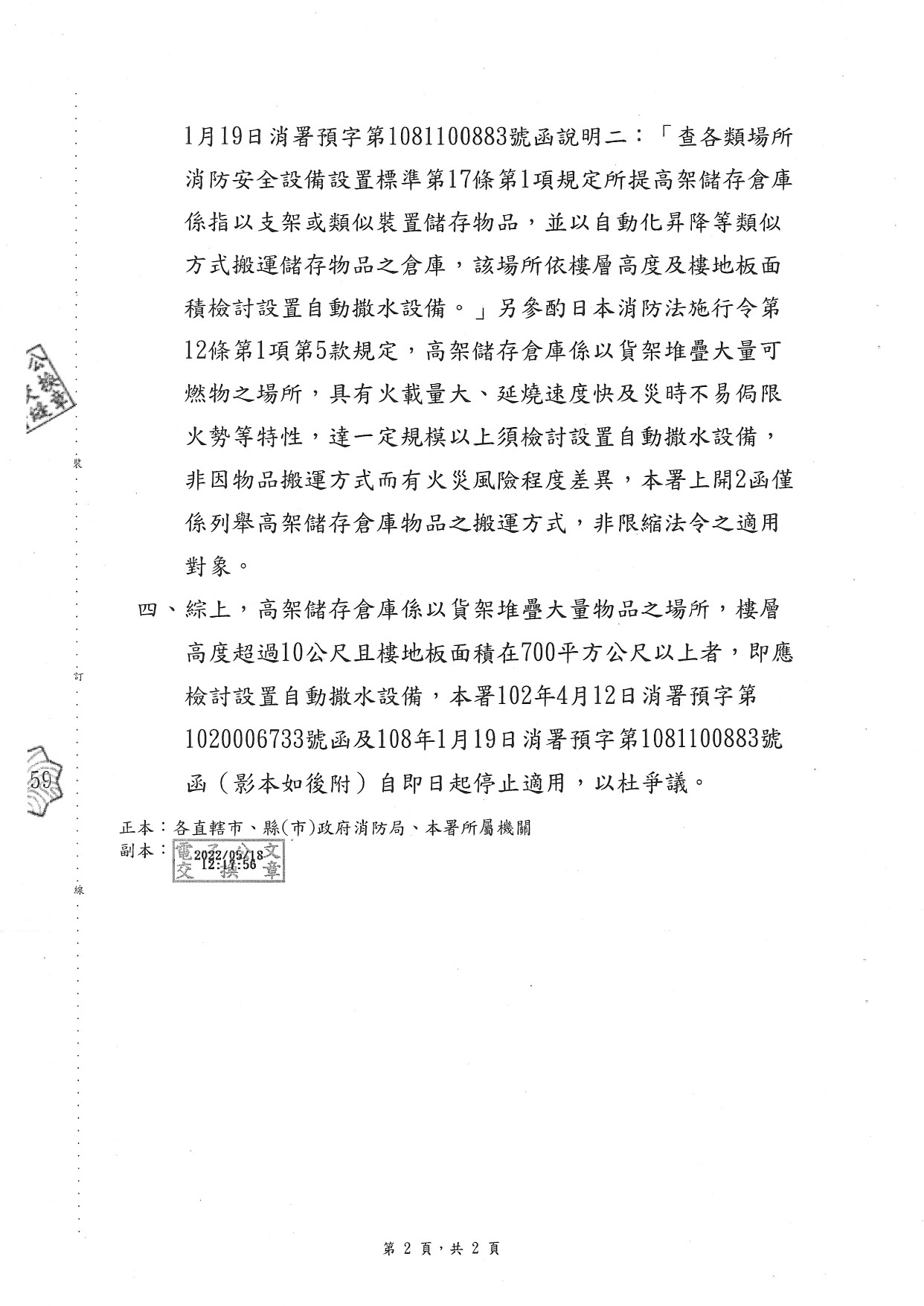 爰高架儲存倉庫應依其樓層高度及樓地板面積檢討設置自動撒水設備。