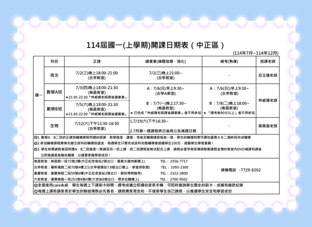 🔥 🔥114屆 國一(上) 最新開課通知(7~12月📆