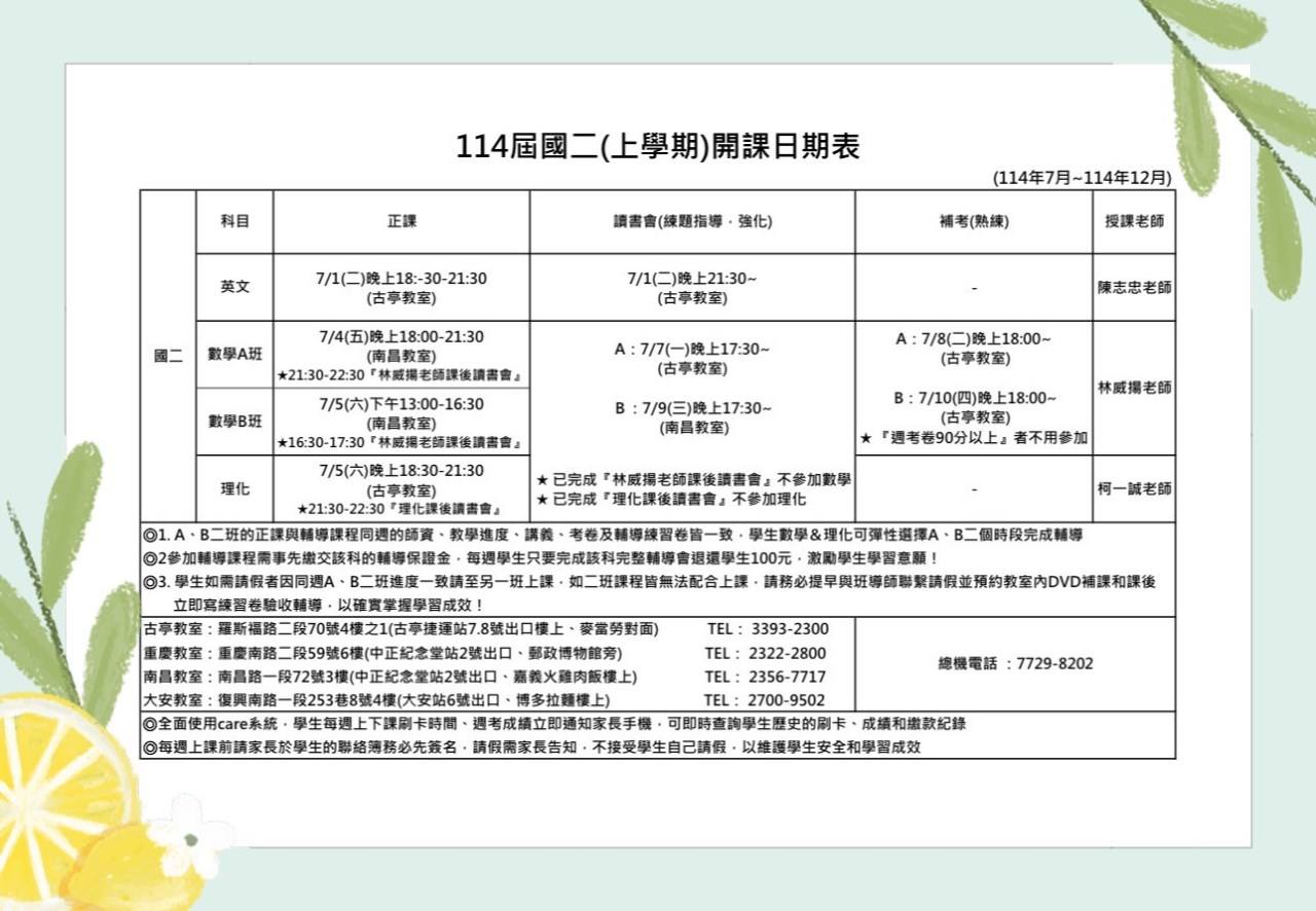 國二理化7月新開課週六晚上18:30-21:30(古亭教室)