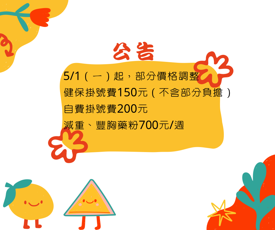 午班門診時間異動,平日週一至週五下午門診時間為14:30-18:00。週六下午門診時間為14:00-17:30。不便之處敬請見諒。 週三晚診20:00掛號截止。但18:00-18:30不休息,持續看診喔!