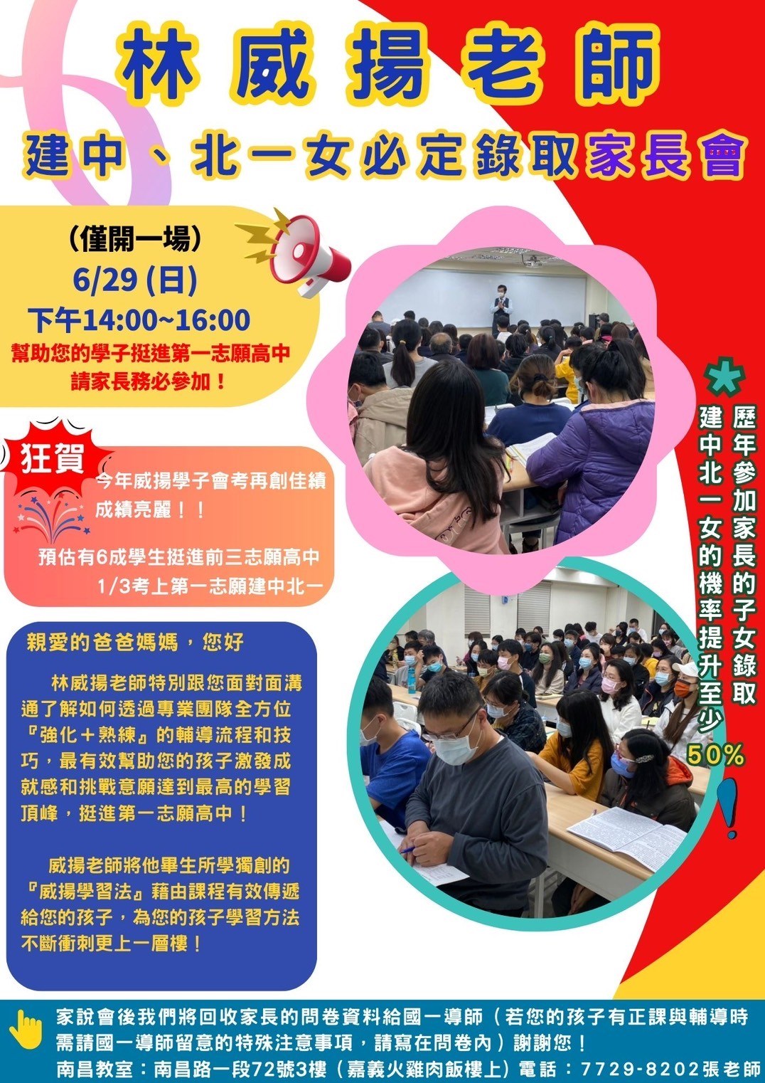 114屆 🤩🤩 6/29(日)下午14:00 林威揚老師建中、北一女必定錄取家長會 敬邀您的學子 挺進第一志願高中❗ ❗