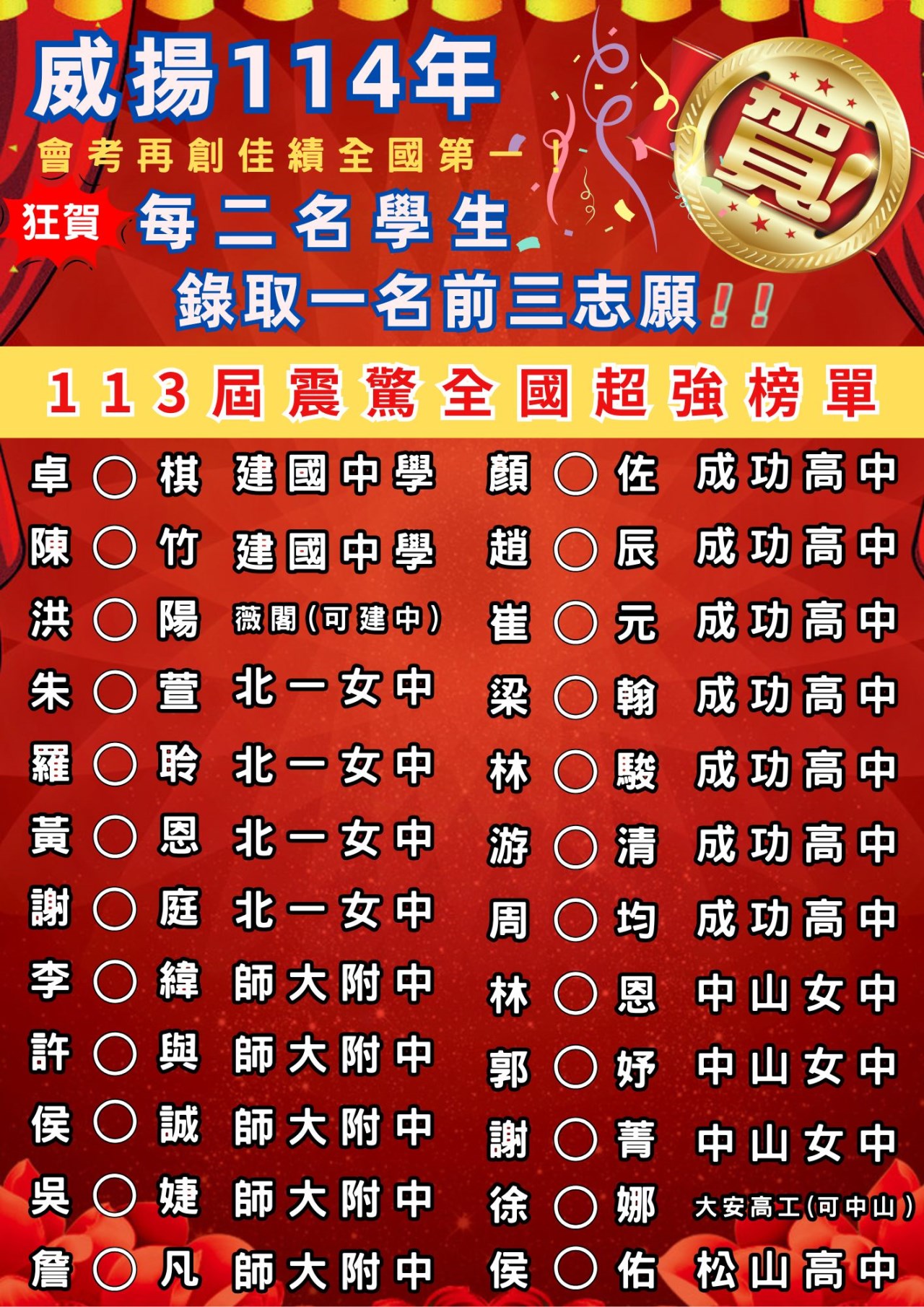 全程參與國三全科衝刺班的同學,錄取建國中學3位(含1名改薇閣),北一女中 4位,師大附中 5位,成功高中 7位,中山女中 4位(含1名改大安高工),松山高中 1位