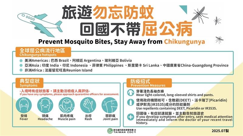疾管署統計截至8月4日,今年屈公病疫情均為境外移入病例,累計16例;其中以印尼13例最多,其次則是菲律賓2例、斯里蘭卡1例。目前境外移入病例數已為近6年同期最高(2020至2024年同期介於0到6例),再加上其病媒蚊與登革熱相同,境外移入引發本土流行的風險增高。