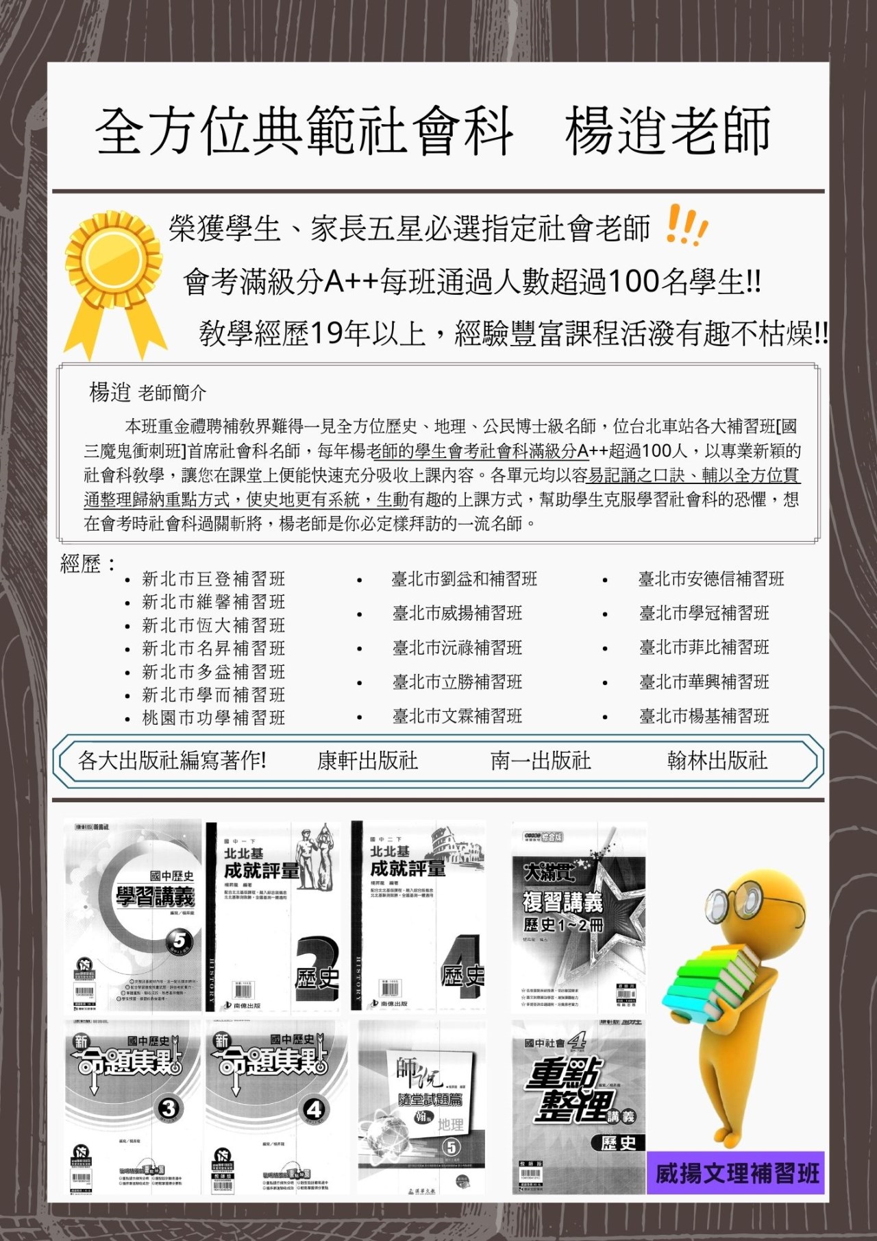 感謝您長久以來對威揚數學的支持與愛戴,威揚數學將於114年10月19日(日)晚上7:00-9:30舉行『如何掌握最後衝刺的黃金一年,挺進建中北一的決勝點 115學年國三全科班說明會』。🤩🤩 當日將由林威揚老師率領九年級師資團隊群竭誠為各位家長解說”如何掌握最後衝刺的黃金一年及九年級全科班課程進度發表”,並邀請新考取前三志願的學長姐回來👏👏👏 幫學弟妹打氣分享自己在威揚成長蛻變的成功故事,讓您的孩子最後一年的會考成績能頂到最高點!絕對值得您帶孩子來參加,衝刺一年挺進建北!!