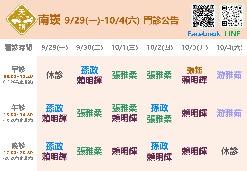 📢9/29(一)~10/4(六)南崁ˋ門診表