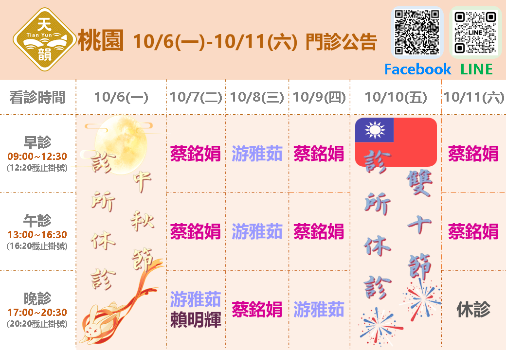 📢10/6(一)~10/11(六)桃園門診表