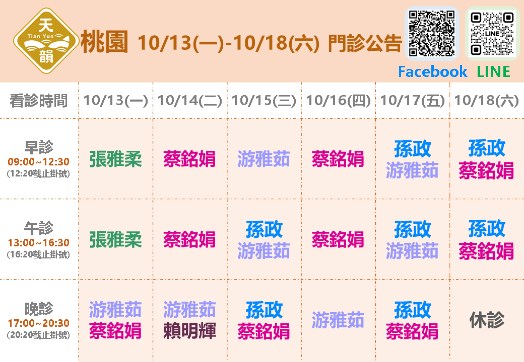 📢10/13(一)~10/18(六)桃園門診表