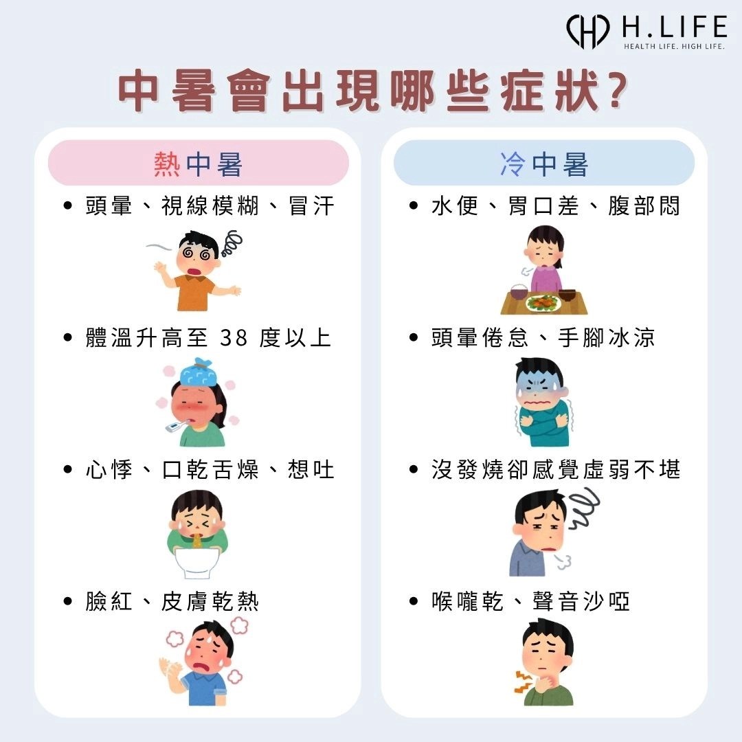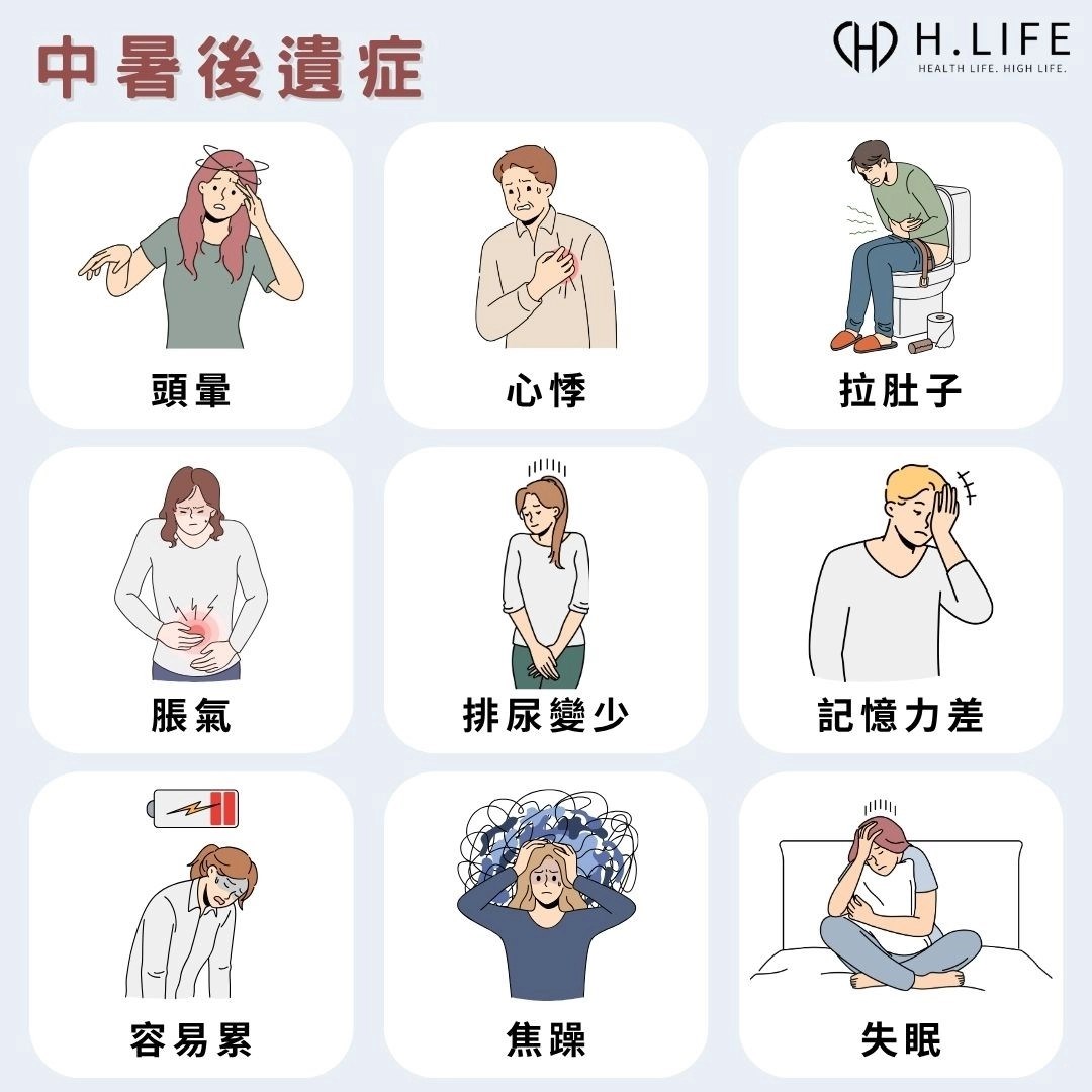 中暑的前期警訊,因大量出汗未補水與電解質引起,常見症狀有疲倦無力、頭暈頭痛、臉色蒼白、血壓偏低等。