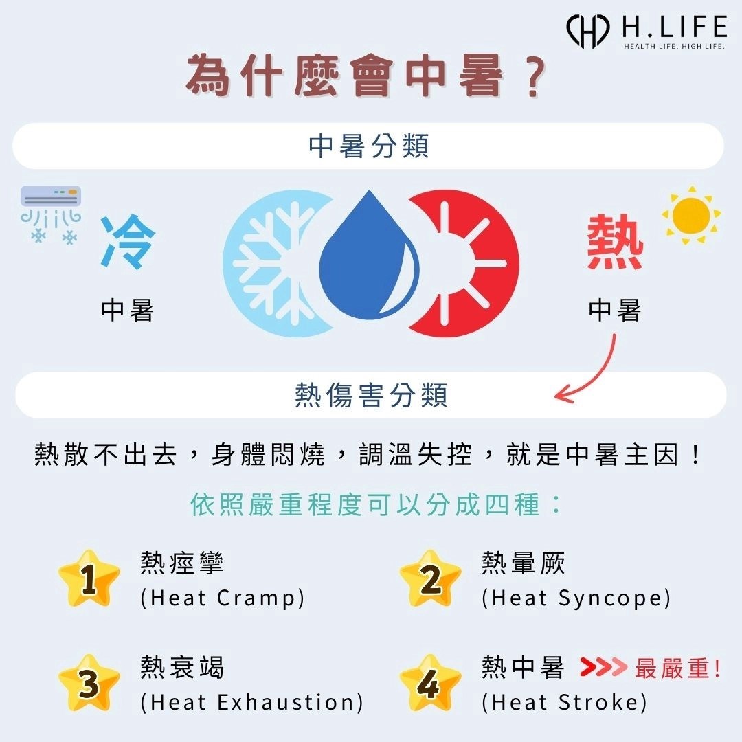 熱傷害包括熱痙攣、熱昏厥、熱衰竭和中暑,而中暑又可以分成熱中暑與冷中暑。