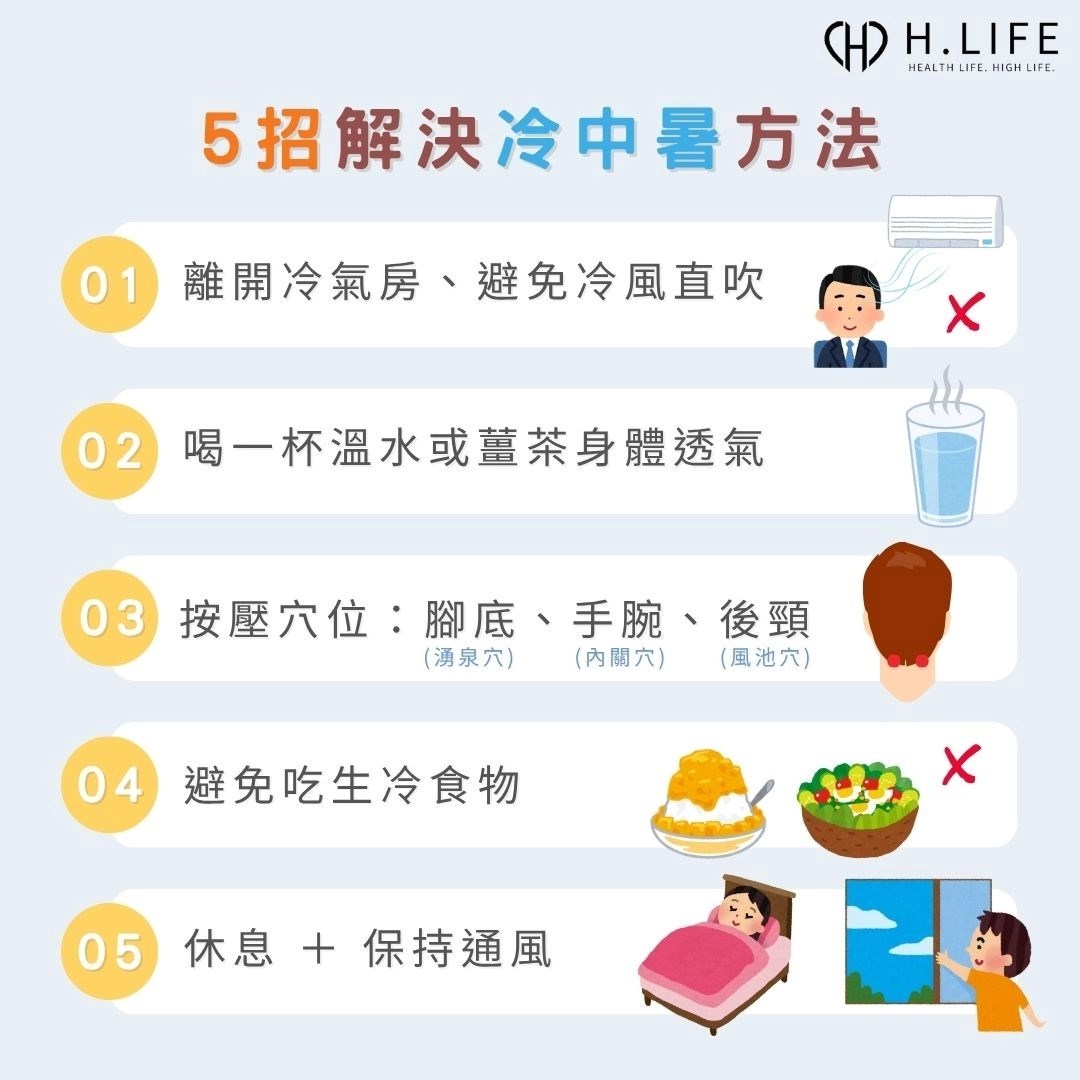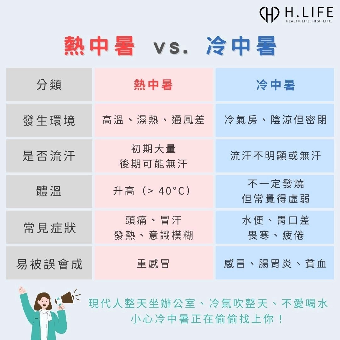 因為長時間待在冷氣房、體內熱能無法排出導致,冷中暑容易與「感冒」「腸胃炎」混淆,例如:水便、頭暈、疲倦。