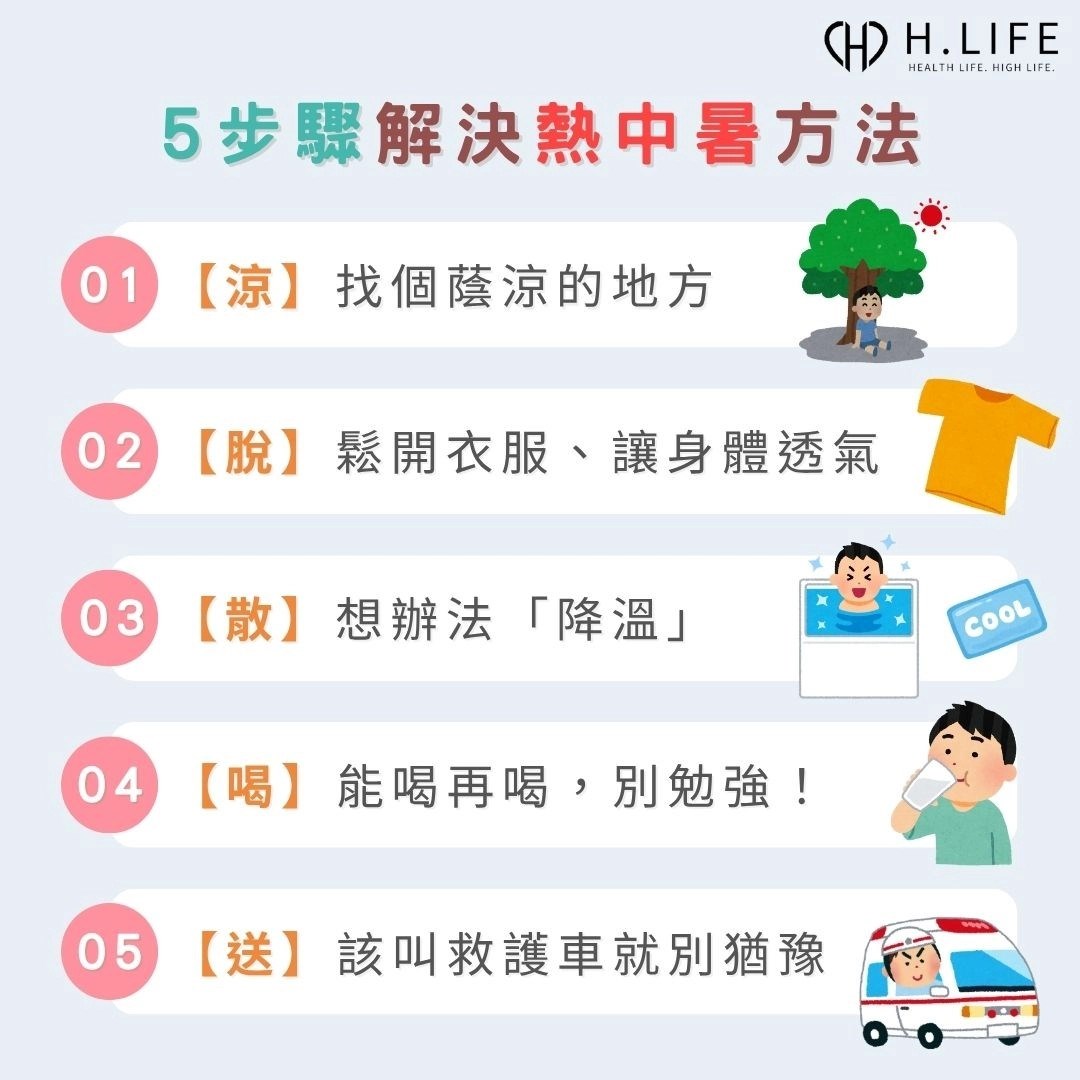 依照衛福部提供的熱傷害急救處理,只要記住這 5 招「涼、脫、散、喝、送」就對了!