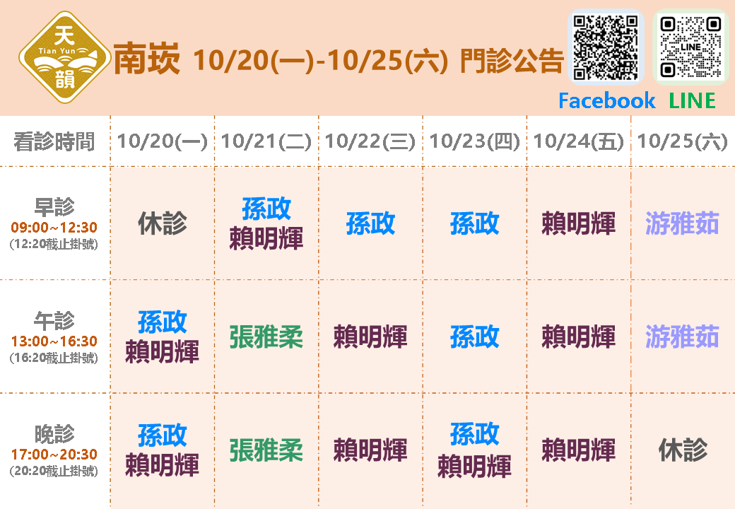 📢10/22(三)、10/23(四)張雅柔醫師早午診請假由孫政醫師代診