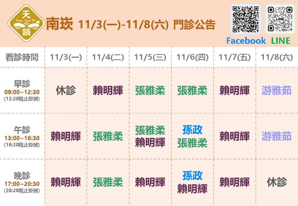 📢11/3(一)~11/8(六)南崁門診表