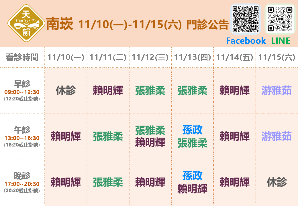 📢11/10(一)~11/15(六)南崁門診表
