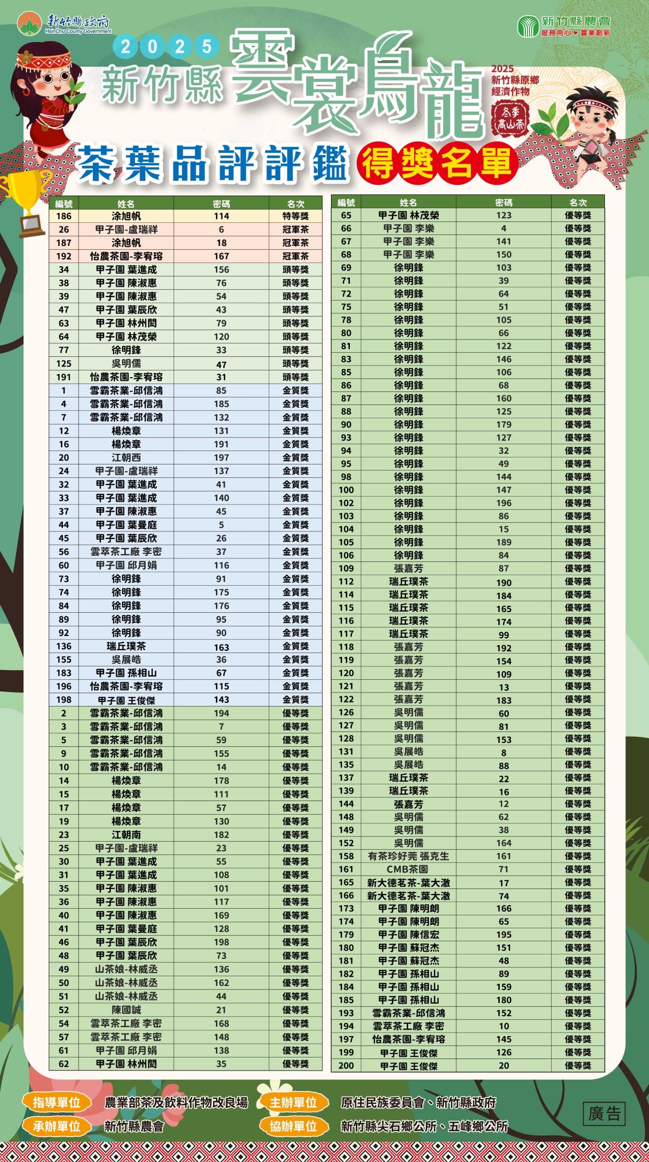 賀雲萃茶作新竹縣高山烏龍茶榮獲金質奬