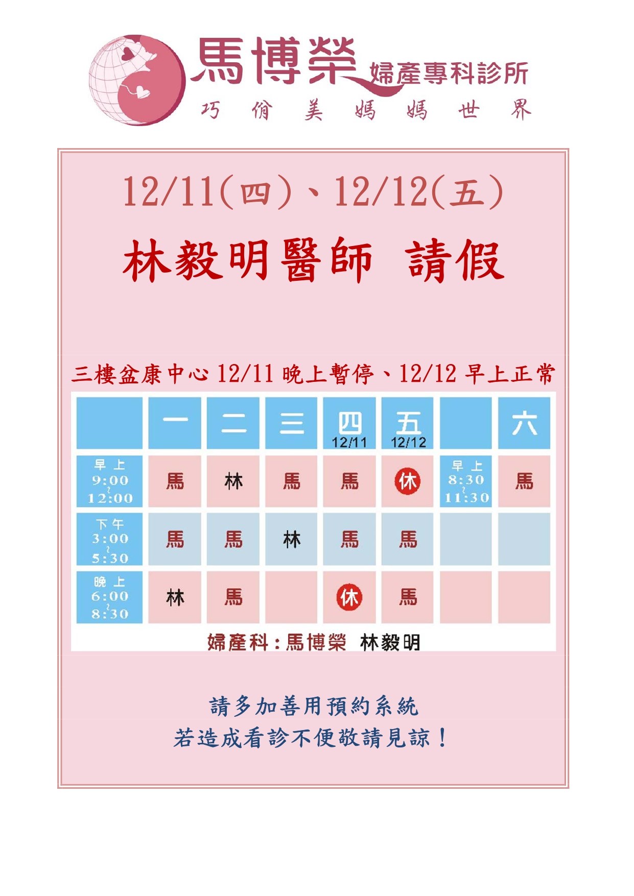 12/11(四)、12/12(五) 林毅明醫師 請假