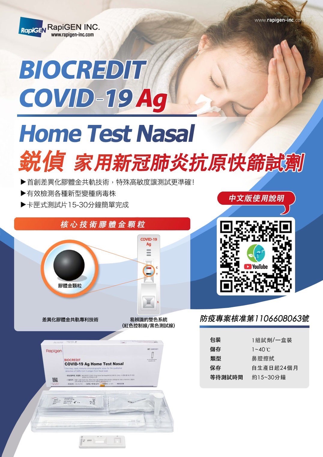 ▎防疫專案核准輸入第1106608063號 ▎規格 : BIOCREDIT COVID-19 Ag Home Test Nasal 單劑盒裝 ▎內容物 ˙塑膠材質托盤x1 ˙過濾蓋x1 ˙檢測液管x1 ˙已滅菌鼻腔拭子x1 ˙測試片x1 ˙使用說明書一份 ▎產地:韓國