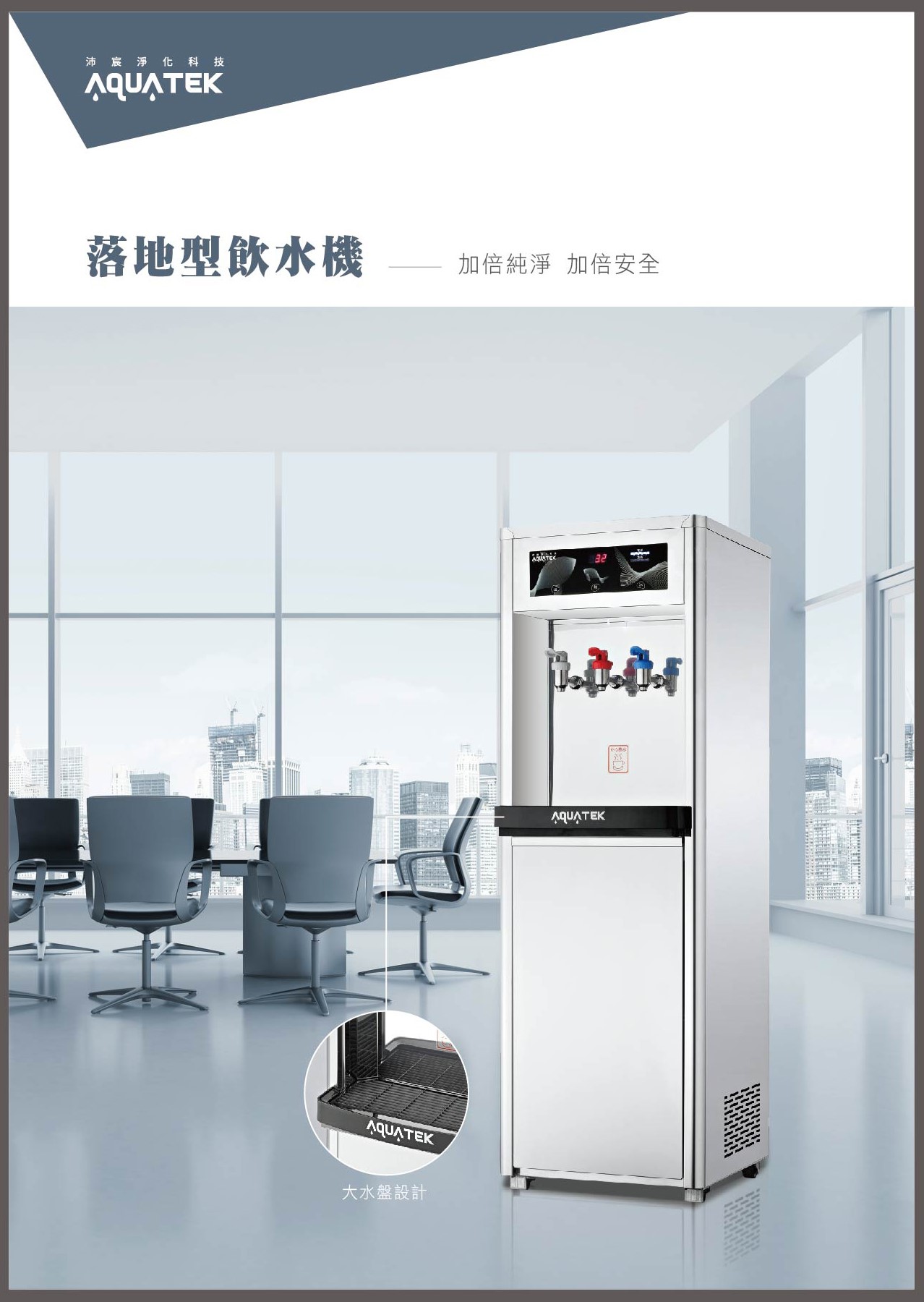 ★大水盤設計,外觀時尚好清潔,防治茶葉、異物阻塞 ★全機亮面430不鏽鋼,美觀大方 ★藍光出水導引,夜間方便取水 ★智能濾心更換提醒,可設定0~12個月 ★熱水安全開關保護 ★智能漏水偵測提示 ★缺水自動進階「防空燒」模式 ★漏電自動進階「斷電」模式 ★淨水器搭配AQ-50-2、AQ-004