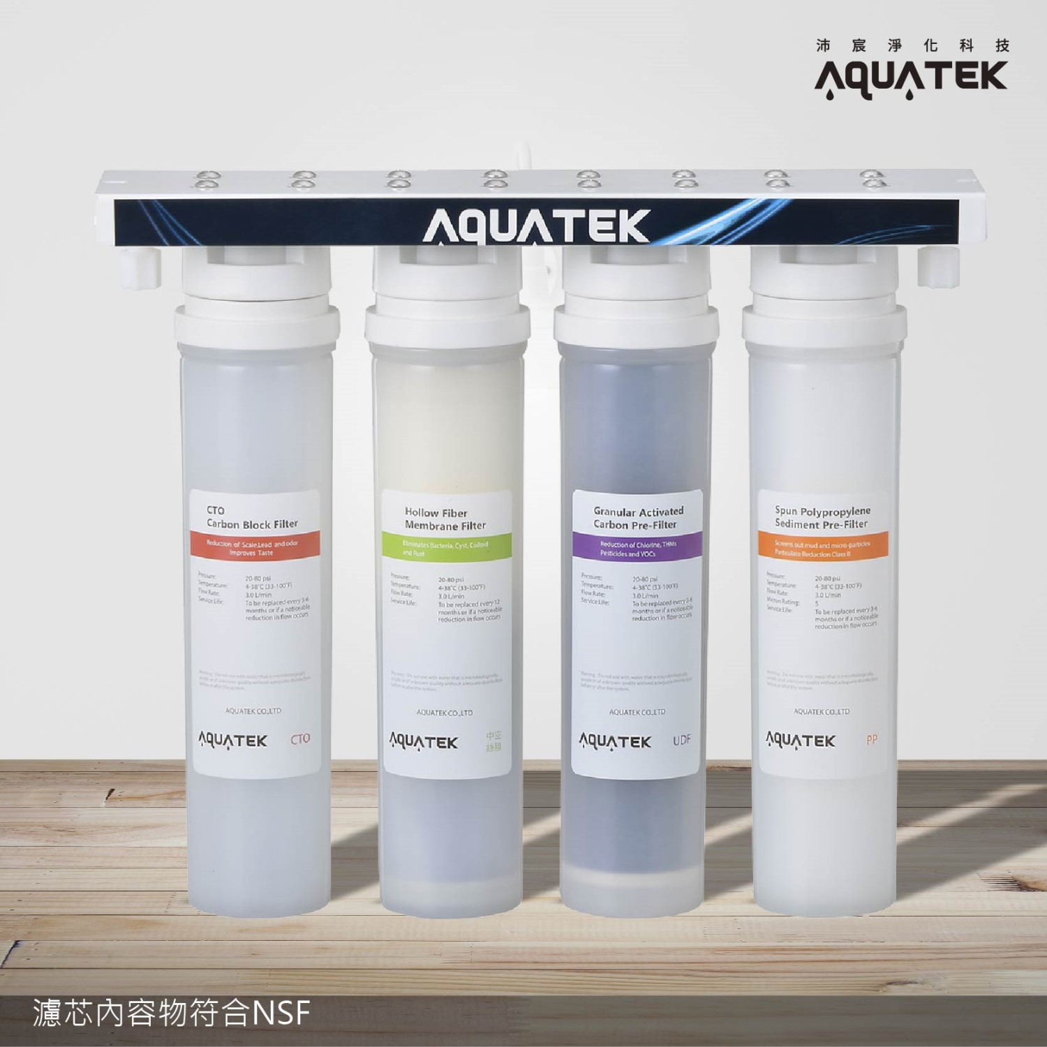 ★第一道:5微米纖維PP(美國NSF) ★第二道:椰殼活性碳粒UDF(美國NSF) ★第三道:椰殼活性碳棒CTO(美國NSF) ★第四道:碳纖維+中空絲膜Hollow Fiber(日本KITZ) ★漏水偵測裝置 ★304不銹鋼龍頭(選配)