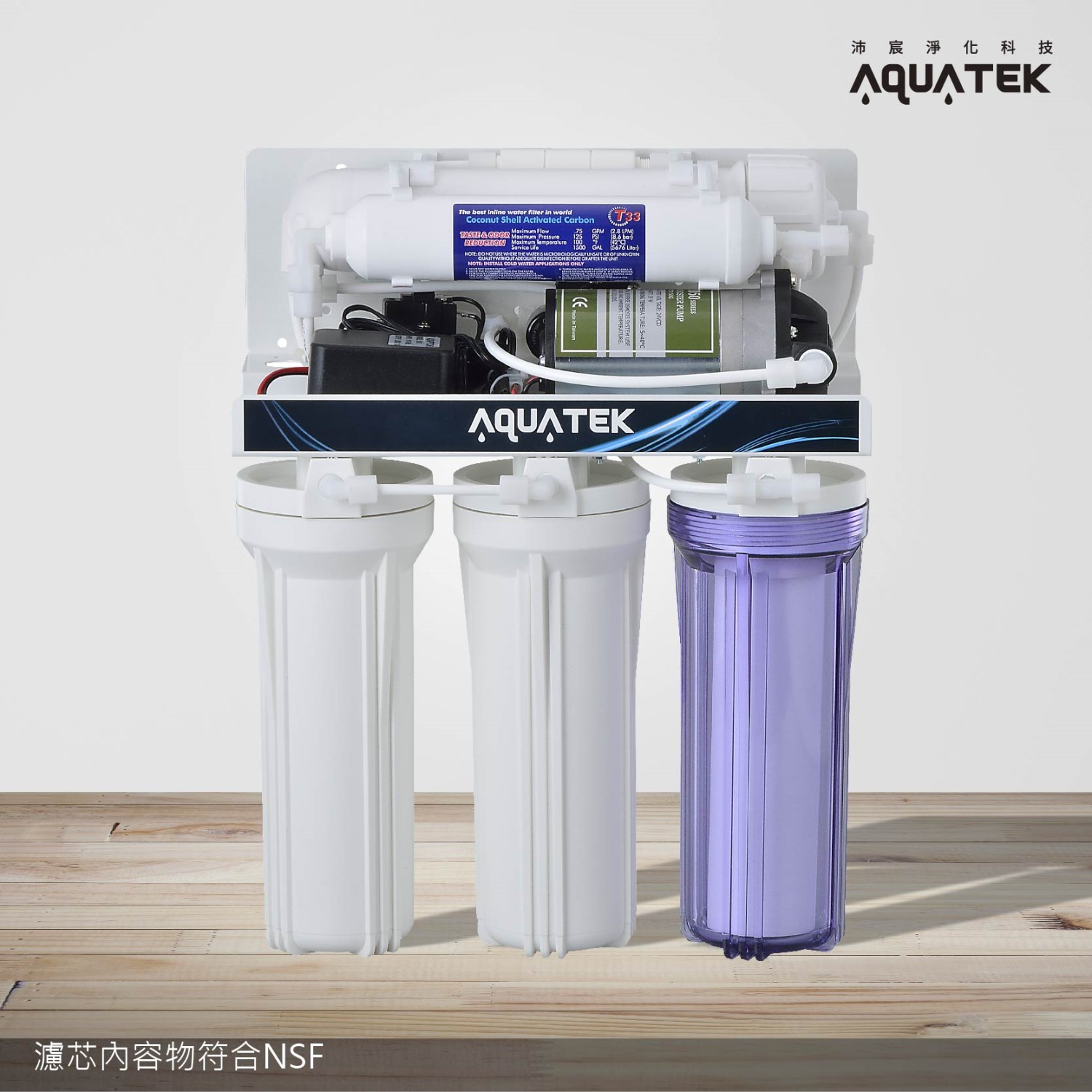 ★第一道:5微米纖維PP(美國NSF) ★第二道:活性碳粒(美國NSF) ★第三道:活性碳棒(美國NSF) ★第四道:沛宸75加侖RO膜(美國NSF) ★第五道:椰殼活性碳粒UDF(美國NSF) ★304不銹鋼龍頭(選配)