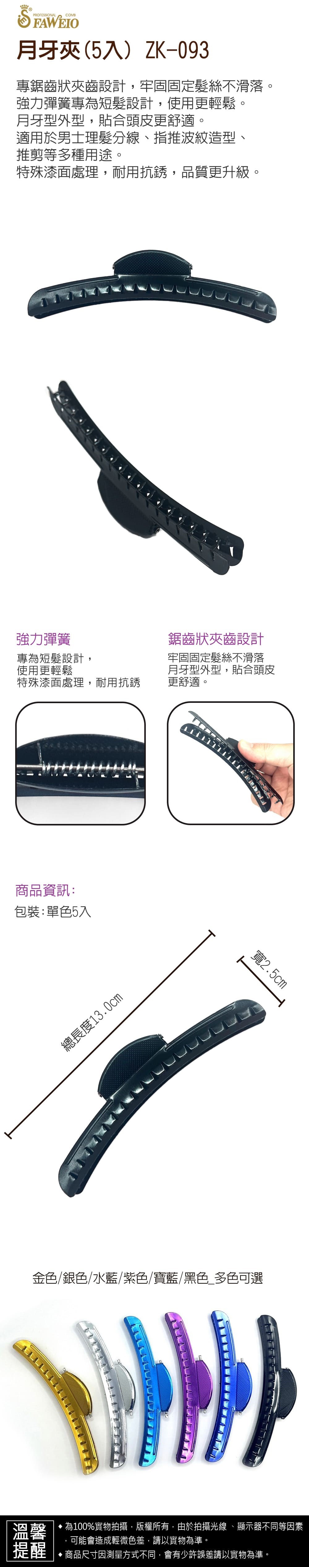 商品規格 : 品牌名稱 : 髮葳鵝 商品品名 : 月牙夾(5入) ZK-093 商品尺寸 : 總長度13.0㎝ x 寬2.5㎝ 商品顏色 : (多色可選) ZK-093-1 月牙夾_金色 ZK-093-2 月牙夾_銀色 ZK-093-3 月牙夾_黑色 ZK-093-4 月牙夾_紫色 ZK-093-5 月牙夾_寶藍 ZK-093-6 月牙夾_水藍