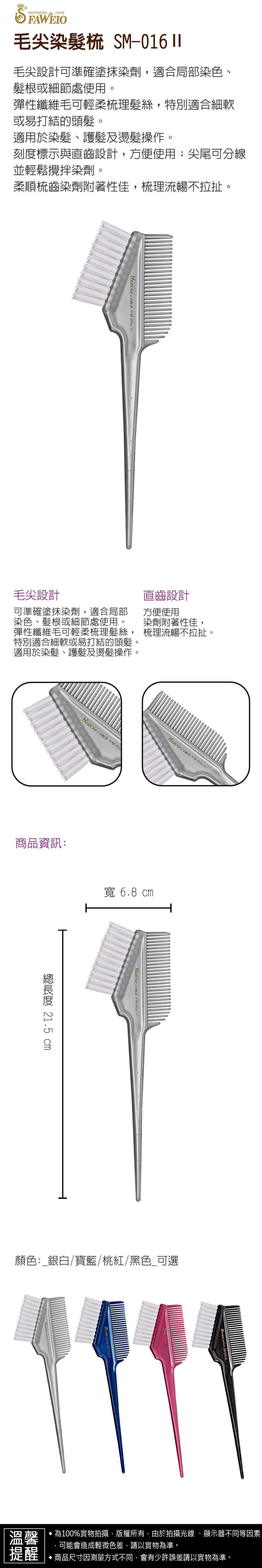 商品規格 : 品牌名稱 : 髮葳鵝 商品品名 : 毛尖染髮梳 SM-016Ⅱ 商品尺寸 : 總長度21.5㎝ x 寬6.8㎝ 商品顏色 : (多色可選) SM-016Ⅱ-1_銀白 SM-016Ⅱ-2_寶藍 SM-016Ⅱ-3_桃紅 SM-016Ⅱ-4_黑色