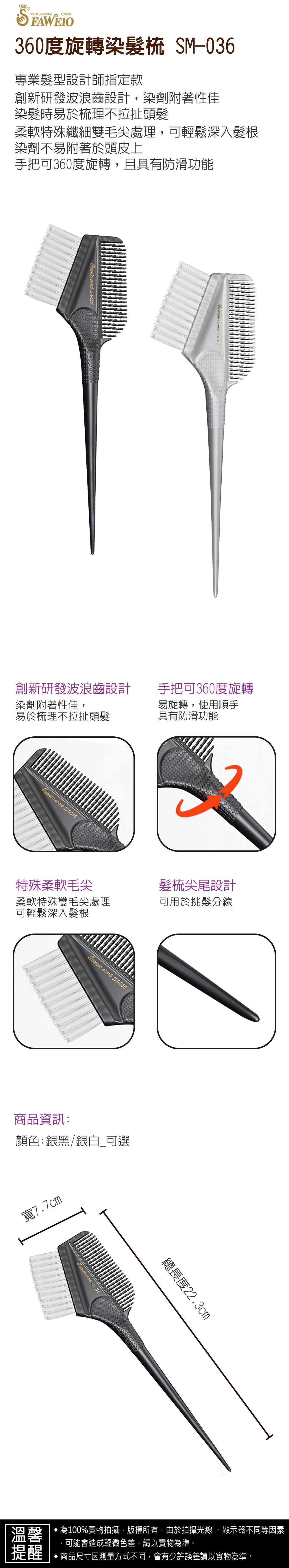 商品規格 : 品牌名稱 : 髮葳鵝 商品品名 : 360度旋轉染髮梳 商品尺寸 : 總長度22.3cmx寬7.7cm 商品材質 : 塑膠+纖維毛尖 商品顏色 : (2色可選) SM-036-1 銀白 SM-036-2 銀黑 注意事項 : 1.尺寸為手工測量,因測量方式不同,會有少許誤差!皆以實品為準。 2.使用後,以溫水清洗晾乾或擦乾,即可重複使用。