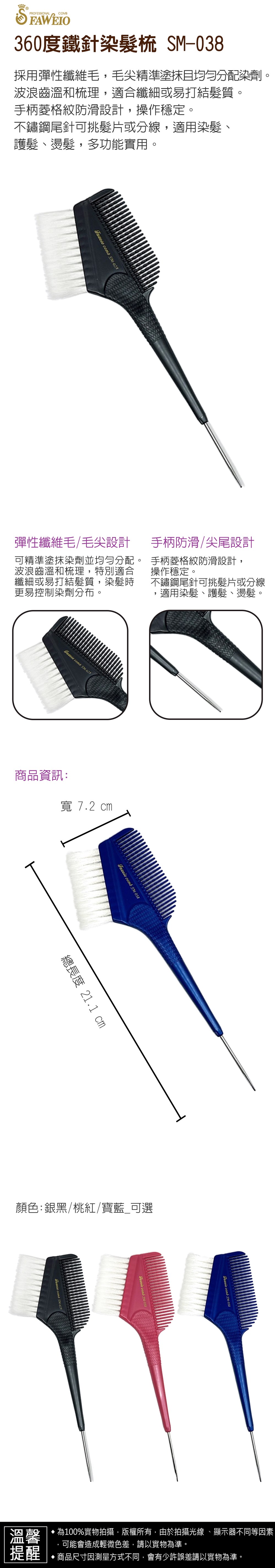 商品規格 : 品牌名稱 : 髮葳鵝 商品品名 : 360度鐡針染髮梳 SM-038 商品尺寸 : 總長度21.1㎝ x 寬7.2㎝ 商品顏色 : (三色可選) SM-038-5 _銀黑 SM-038-6 _桃紅 SM-038-7 _寶藍