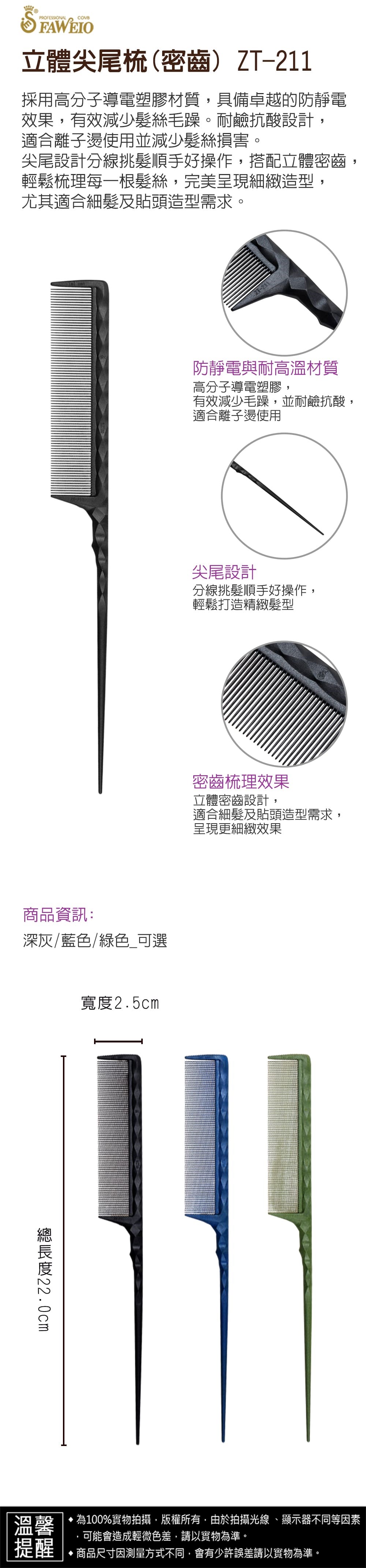 商品規格 : 品牌名稱 : 髮葳鵝 商品品名 : 立體尖尾梳(密齒) ZT-211 商品尺寸 : 總長度22cm x 寬2.5cm 商品顏色 : 三色可選 ZT-211 深灰 ZT-211-1 藍色 ZT-211-2 綠色