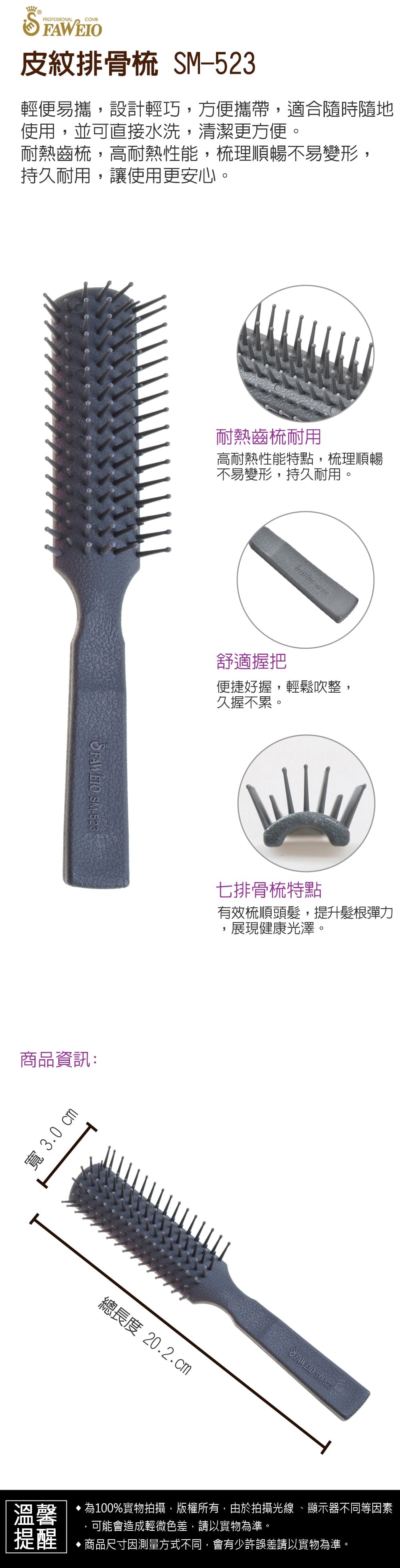 *7排設計排骨梳的昇華版。 *特殊表面設計,便於握拿梳理不滑手。 *基本7排設計,適用髮拉或拉角度。 *專業使用設計,耐熱不易變形。