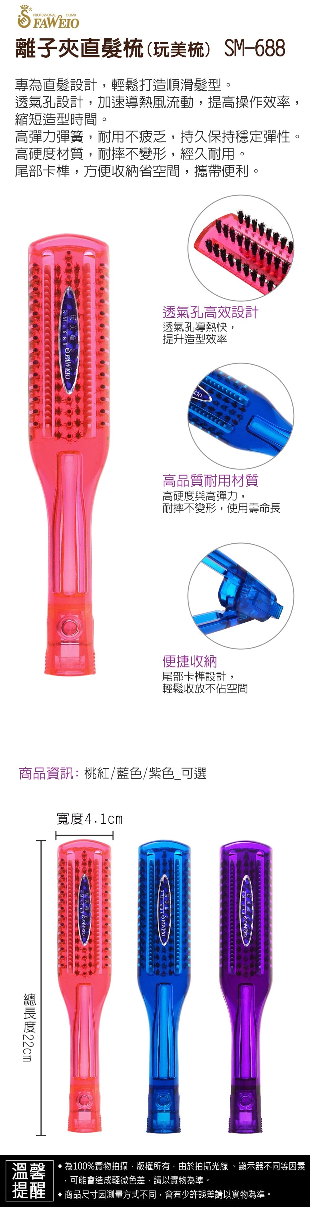 商品規格 : 品牌名稱 : 髮葳鵝 商品品名 : 離子夾直髮梳(玩美梳) SM-688 商品尺寸 : 總長度22.0cm x 寬度4.1cm 商品顏色 : (多色可選) SM-688-1 桃紅 SM-688-2 藍色 SM-688-3 紫色