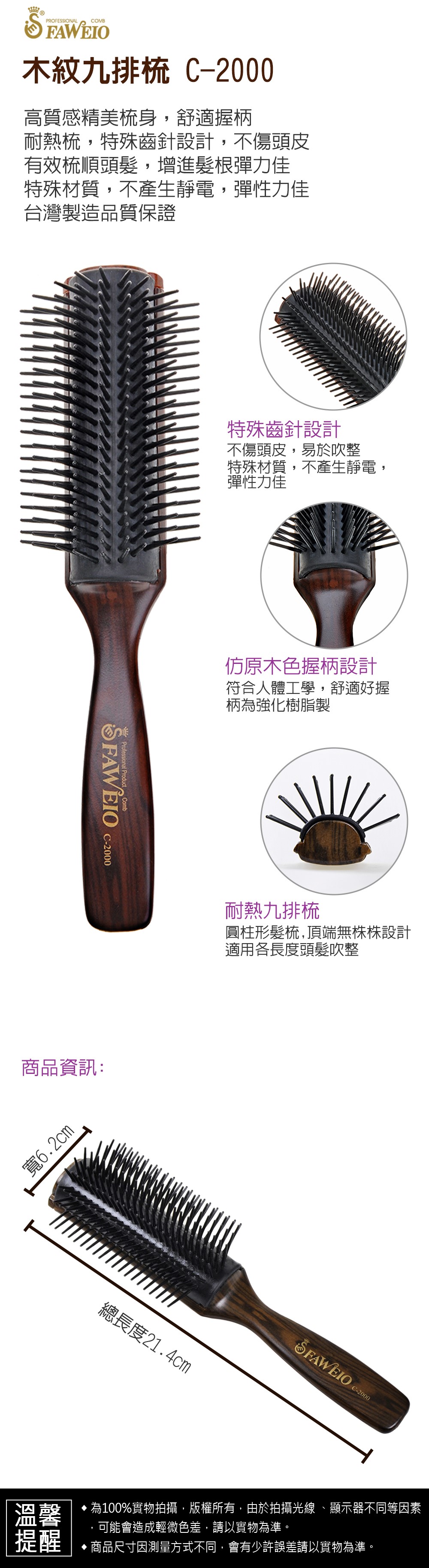 商品規格 : 品牌名稱 : 髮葳鵝 商品品名 : 木紋九排梳 C-2000 商品尺寸 : 總長度21.4cm x 寬6.2cm