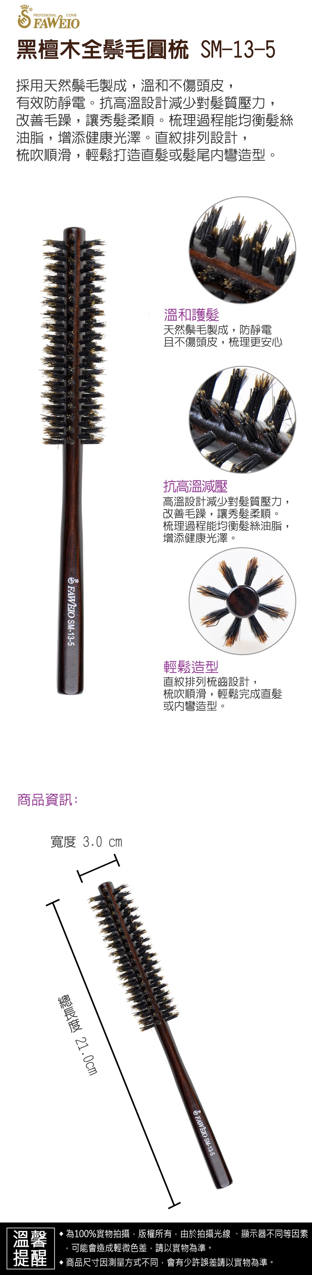 商品規格 : 品牌名稱 : 髮葳鵝 商品品名 : 黑檀木全鬃毛圓梳 SM-13-5 特小(8排) 商品尺寸 : 總長度21cm x 寬3cm、植毛長度10cm 商品材質 : 天然原木+鬃毛 商品重量 : 21.4g