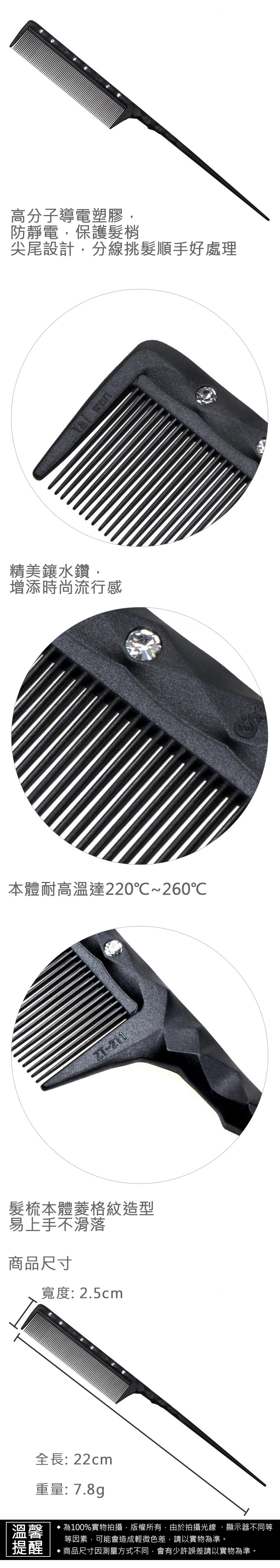 ♦ 耐高溫達220℃~260℃ ♦ 耐鹼抗酸,卓越的抗藥性 ♦ 高分子導電塑膠,防靜電,保護髮梢 ♦ 精美鑲水鑽,增添時尚流行感 ♦ 尖尾設計,分線挑髮順手好處理