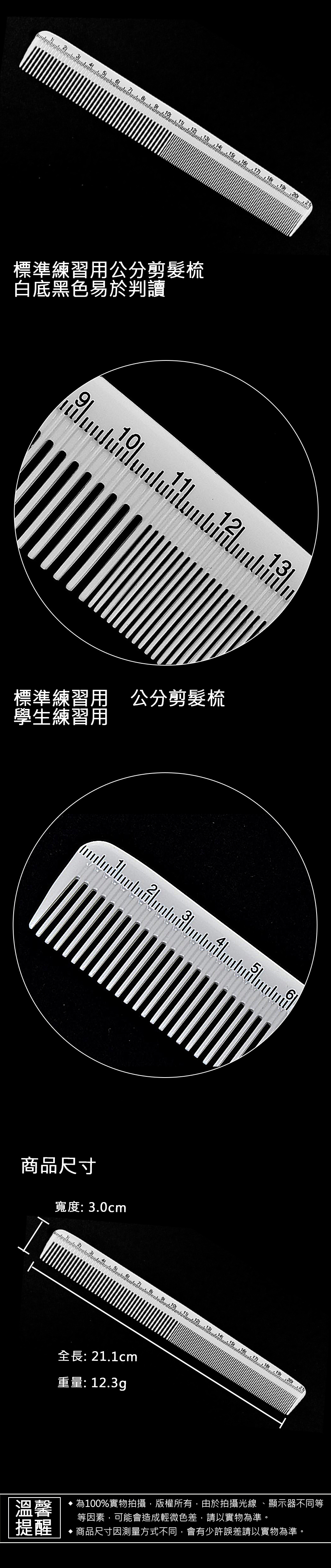 ♦ 耐熱溫度:180℃ ♦ 防靜電、耐衝擊、高鋼性 ♦ 標準練習用公分剪髮梳 ♦ 白底黑色易於判讀 ♦ 最長21公分使用。 ♦ 本體白色,與髮色對比較大,較不傷視力 ♦ 學生檢定專用