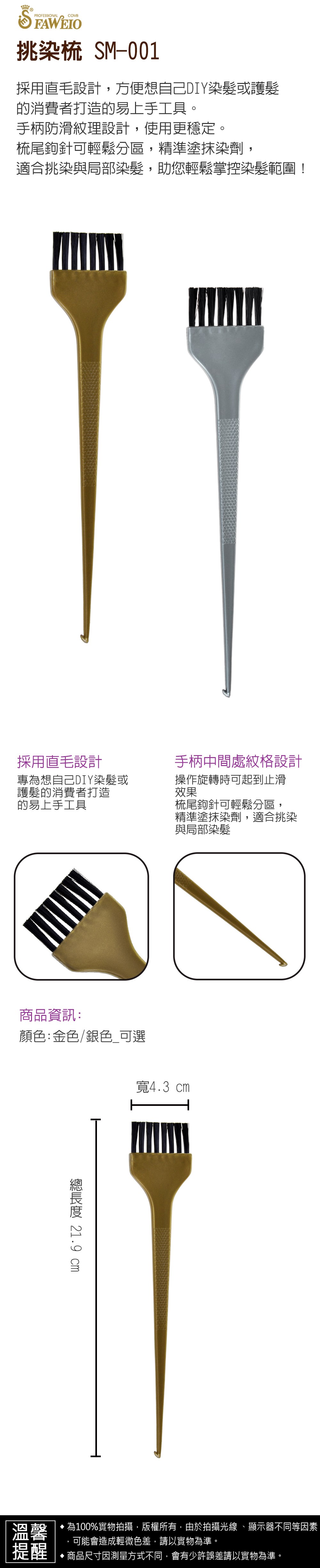 商品規格 : 品牌名稱 : 髮葳鵝 商品品名 : 挑染梳 SM-001 商品尺寸 : 總長度21.9㎝ x 寬4.3㎝ 商品顏色 : (二色可選) SM-001-1_金色 SM-001-2_銀色