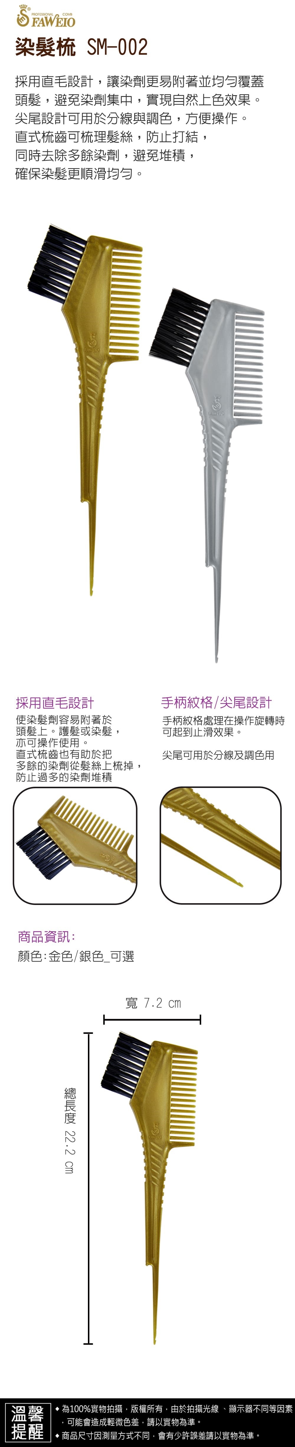商品規格 : 品牌名稱 : 髮葳鵝 商品品名 : 染髮梳 SM-002 商品尺寸 : 總長度22.2㎝ x 寬7.2㎝ 商品顏色 : (二色可選) SM-002-1_金色 SM-002-2_銀色