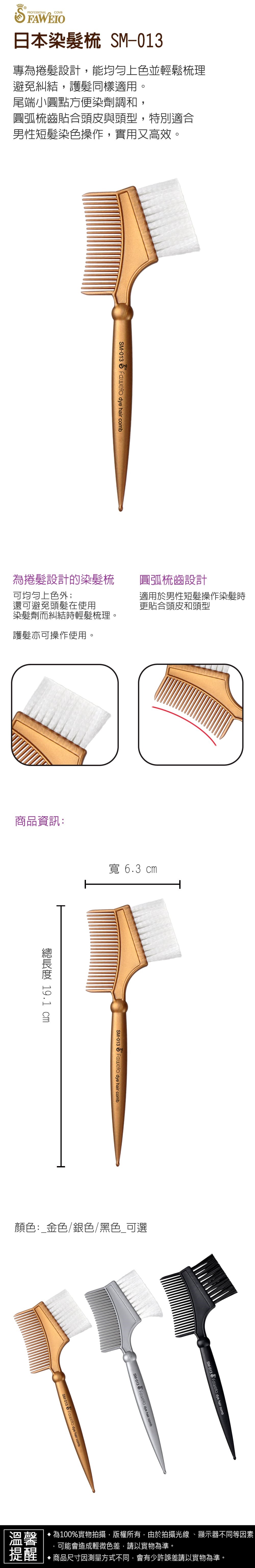商品規格 : 品牌名稱 : 髮葳鵝 商品品名 : 日本染髮梳 SM-013 商品尺寸 : 總長度19.1㎝ x 寬6.3㎝ 商品顏色 : (三色可選) SM-013-1 金色 SM-013-2_銀色 SM-013-3_黑色